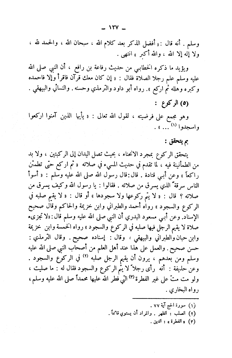 (5) الركوع: وهو مجمع على فرضيته، لقول الله تعالى: (يأيها الذين آمنوا اركعوا واسجدوا (1) ... ) .