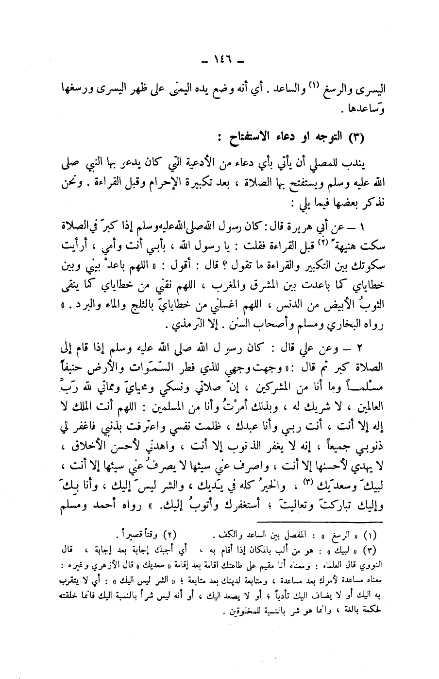 2 - وعن علي قال: كان رسول الله صلى الله عليه وسلم إذا قام إلى الصلاة كبر ثم قال: (وجهت وجهي للذي فطر السموات والارض حنيفا مسلما وما أنا من المشركين، إن صلاتي ونسكي ومحياي ومماتي لله رب العالمين، لا شريك له، وبذلك أمرت وأنا من المسلمين: اللهم أنت الملك لا إله إلا أنت، أنت ربي وأنا عبدك، ظلمت نفسي واعترفت بذنبي فاغفر لي ذنوبي جميعا، إنه لا يغفر الذنوب إلا أنت، واهدني لاحسن الاخلاق، لا يهدي لاحسنها إلا أنت، واصرف عني سيئها لا يصرف عني سيئها إلا أنت، لبيك وسعديك (3) ، والخير كله في يديك، والشر ليس إليك، وأنا بك وإليك تباركت وتعاليت، أستغفرك وأتوب إليك.) رواه أحمد ومسلم