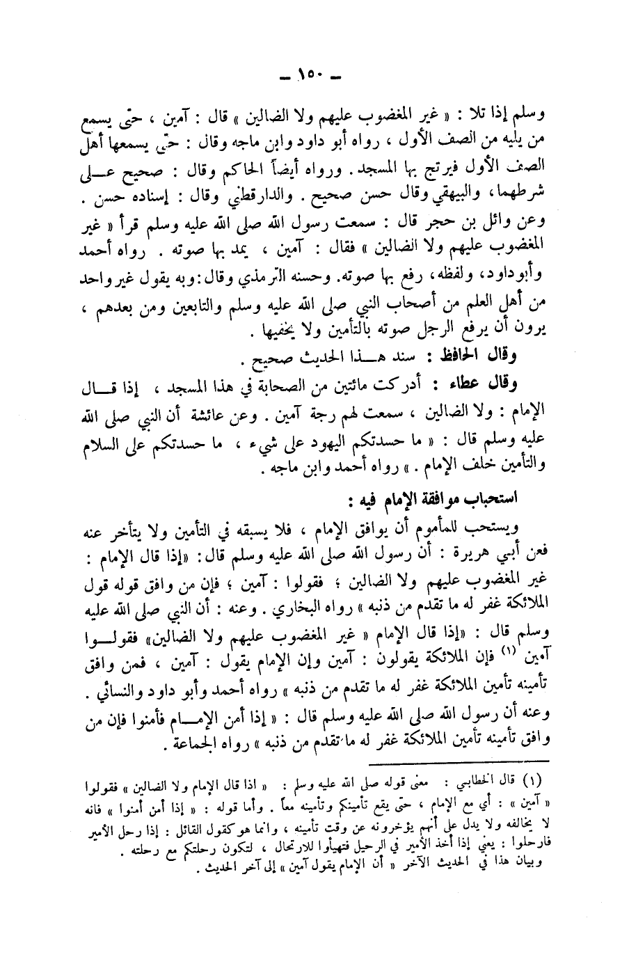 وعن وائل بن حجر قال: سمعت رسول الله صلى الله عليه وسلم قرأ (غير المغضوب عليهم ولا الضالين) فقال: آمين، يمد بها صوته.
