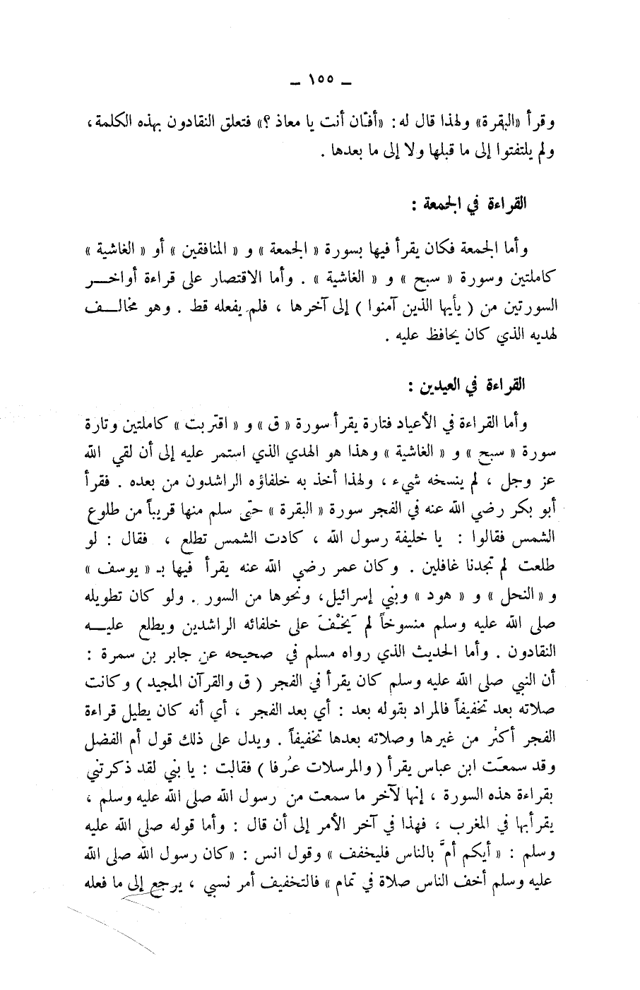 وأما القراءة في الاعياد فتارة يقرأ سورة (ق) و (اقتربت) كاملتين وتارة سورة (سبح) و (الغاشية) وهذا هو الهدي الذي استمر عليه إن أن لقي الله عزوجل، لم ينسخه شئ، ولهذا أخذ به خلفاؤه الراشدون من بعده.