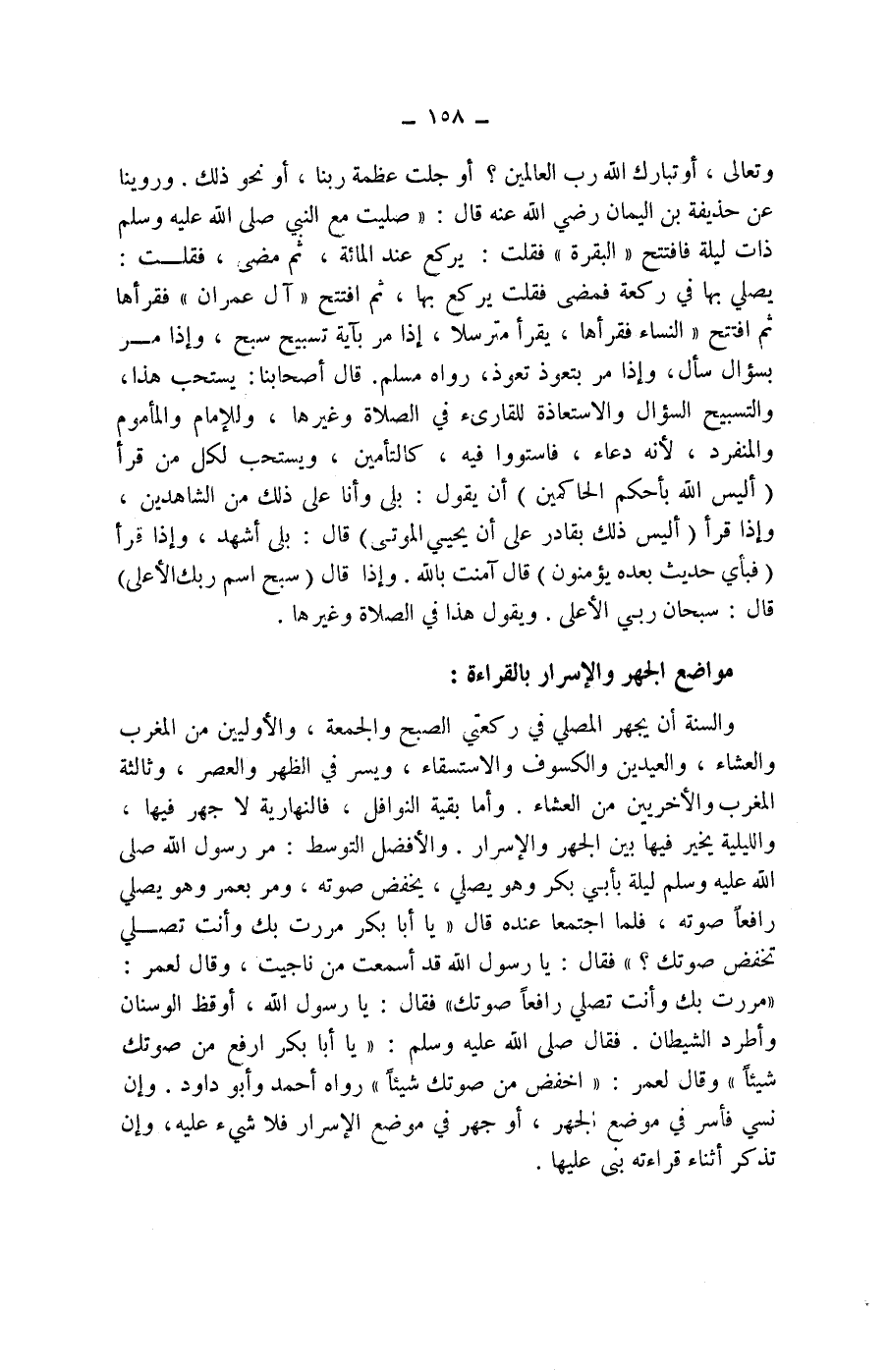 مر رسول الله صلى الله عليه وسلم ليلة بأبي بكر وهو يصلي، يخفض صوته، ومر بعمر وهو يصلي رافعا صوته، فلما اجتمعا عنده قال: (يا أبا بكر مررت بك وأنت تصلي تخفض صوتك؟) فقال: يا رسول الله قد أسمعت من ناجيت، وقال لعمر: (مررت بك وأنت تصلي رافعا صوتك) فقال: يا رسول الله، أوقظ الوسنان وأطرد الشيطان.