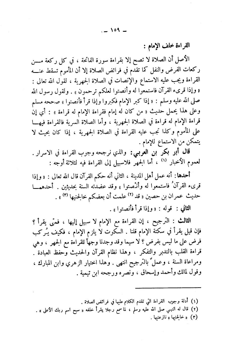 ولقول رسول الله صلى الله عليه وسلم: (إذا كبر الامام فكبروا وإذا قرأ فأنصتوا) صححه مسلم وعلى هذا يحمل حديث (من كان له إمام فقراءة الامام له قراءة) : أي إن قراءة الامام له قراءة في الصلاة الجهرية، وأما الصلاة السرية فالقراءة فيها على المأموم وكذا تجب عليه القراءة في الصلاة الجهرية، إذا كان بحيث لا يتمكن من الاستماع للامام.