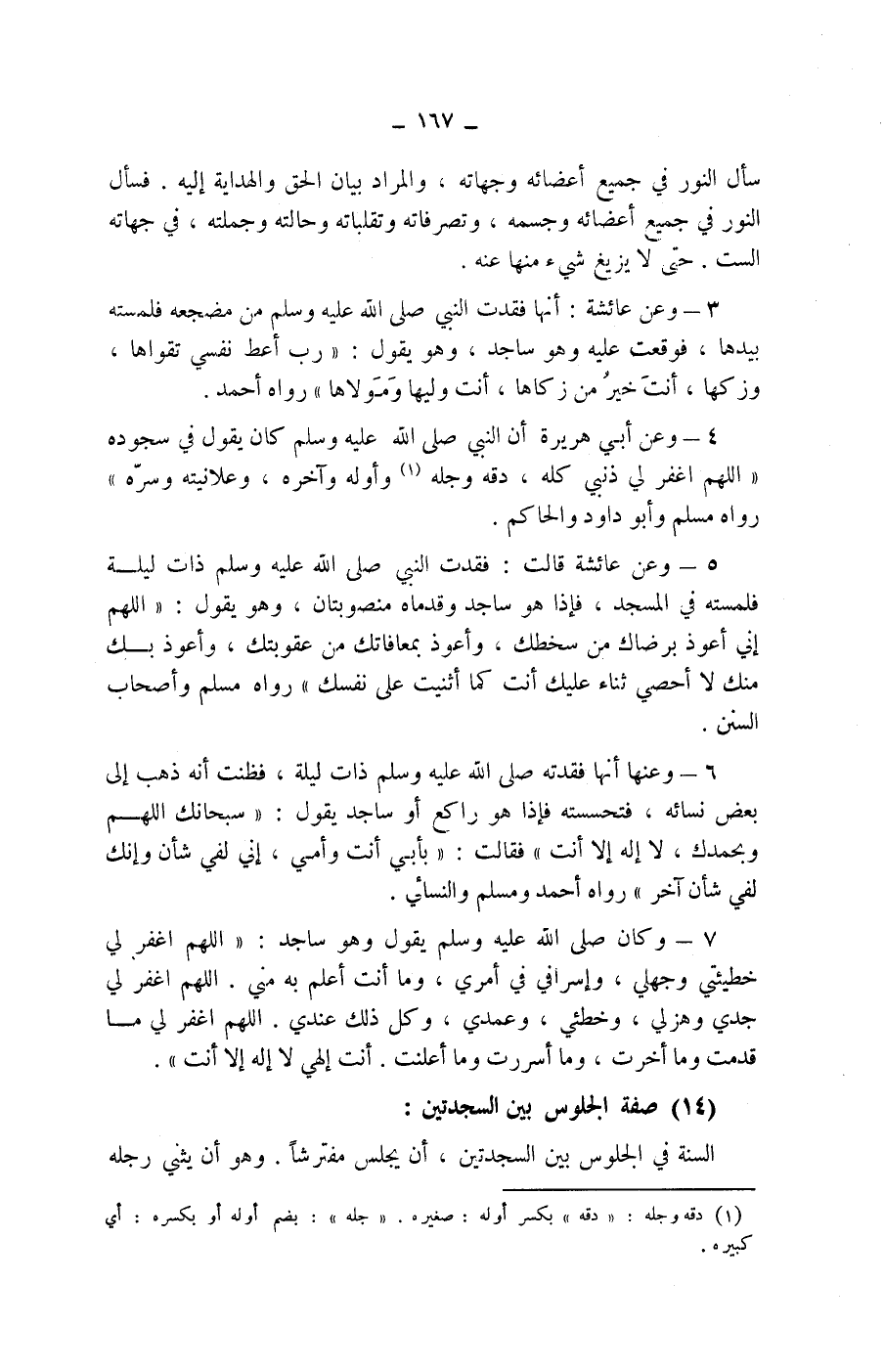 3 - وعن عائشة: أنها فقدت النبي صلى الله عليه وسلم من مضجعه فلمسته بيدها، فوقعت عليه وهو ساجد، وهو يقول: (رب أعط نفسي تقواها، وزكها، أنت خير من زكاها، أنت وليها ومولاها) رواه أحمد.
