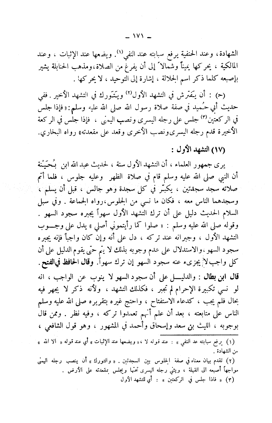(17) التشهد الاول: يرى جمهور العلماء، أن التشهد الاول سنة، لحديث عبد الله ابن بحينة