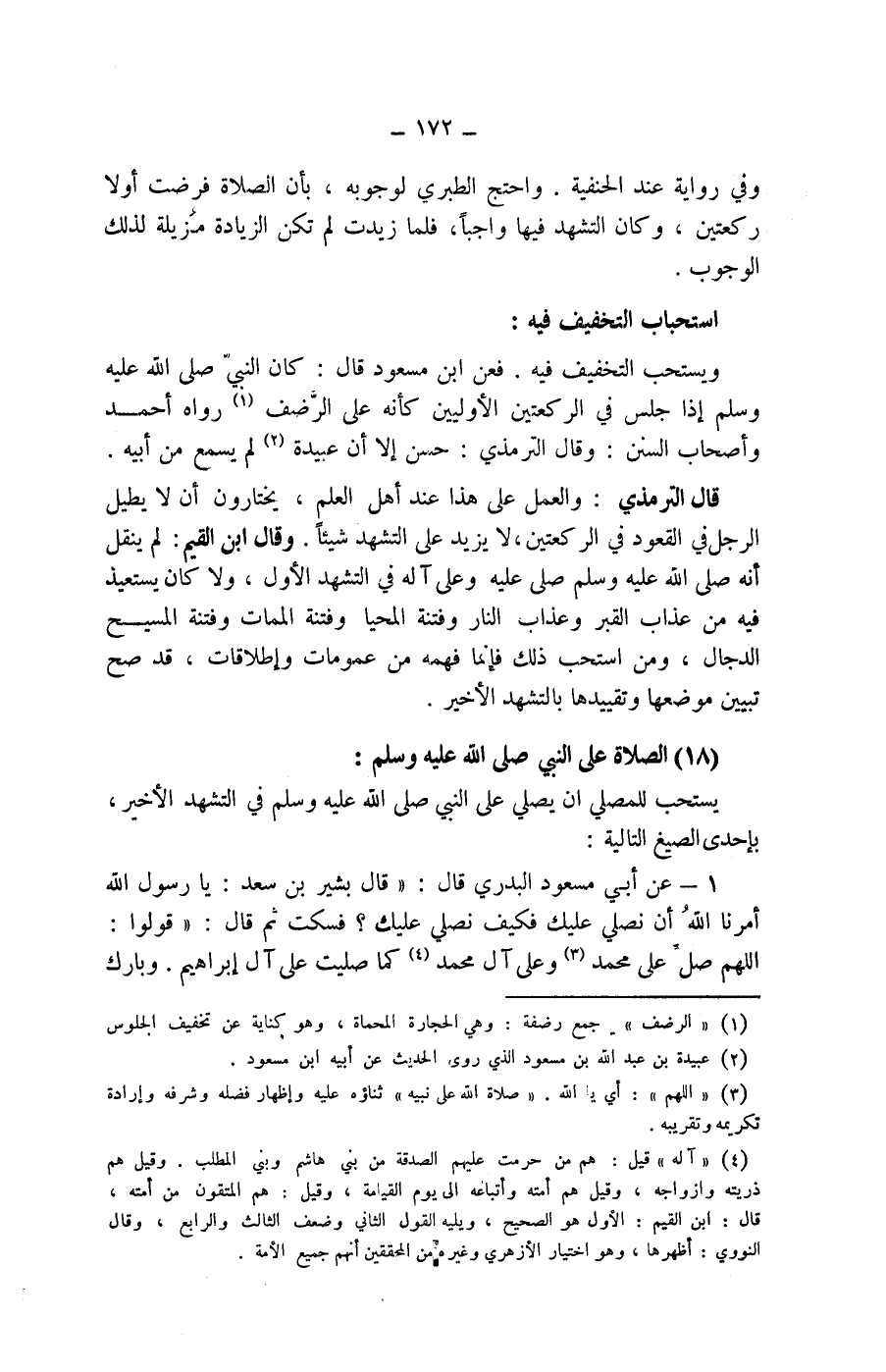 (18) الصلاة على النبي صلى الله عليه وسلم: يستحب للمصلي أن يصلي على النبي صلى الله عليه وسلم في التشهد الاخير، بإحدي الصيغ التالية: 1 - عن أبي مسعود البدري قال: (قال بشير بن سعد: يا رسول الله أمرنا الله أن نصلي عليك فكيف نصلي عليك؟ فسكت ثم قال: (قولوا: اللهم صل على محمد (3) وعلى آل محمد (4) كما صليت على آل إبراهيم. وبارك