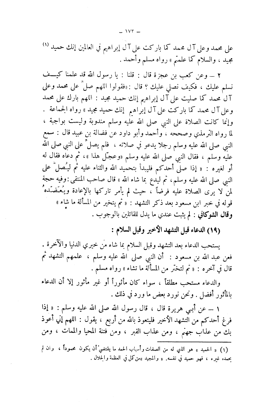 على محمد وعلى آل محمد كما باركت على آل إبراهيم في العالمين إنك حميد (1) مجيد، والسلام كما علمتم) رواه مسلم وأحمد.