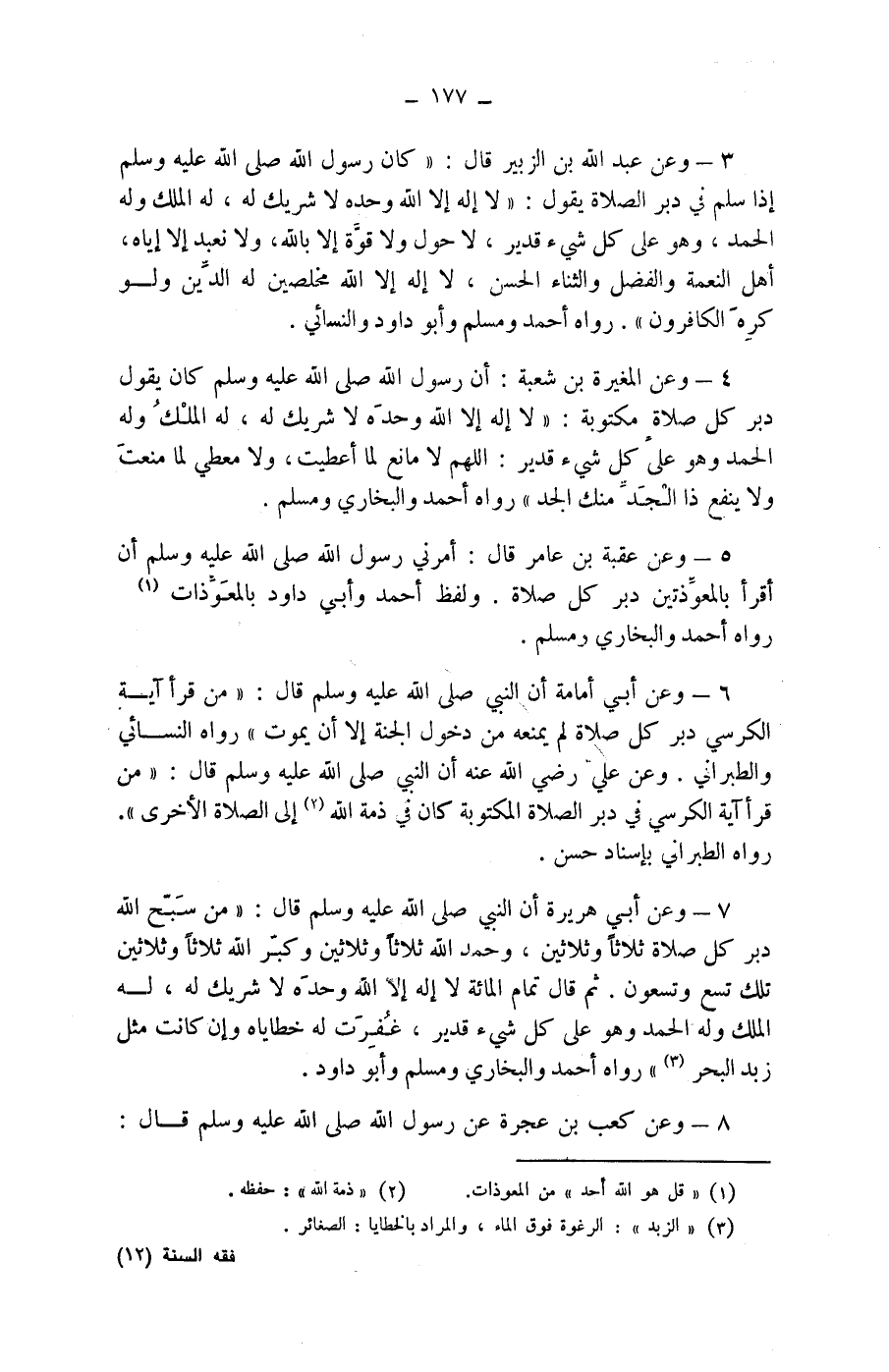 7 - وعن أبي هريرة أن النبي صلى الله عليه وسلم قال: (من سبح الله دبر كل صلاة ثلاثا وثلاثين، وحمد الله ثلاثا وثلاثين وكبر الله ثلاثا وثلاثين تلك تسع وتسعون. ثم قال تمام المائة لا إله إلا الله وحده لا شريك له، له الملك وله الحمد وهو على كل شئ قدير، غفرت له خطاياه وإن كانت مثل زيد البحر (3)) رواه أحمد والبخاري ومسلم وأبو داود.