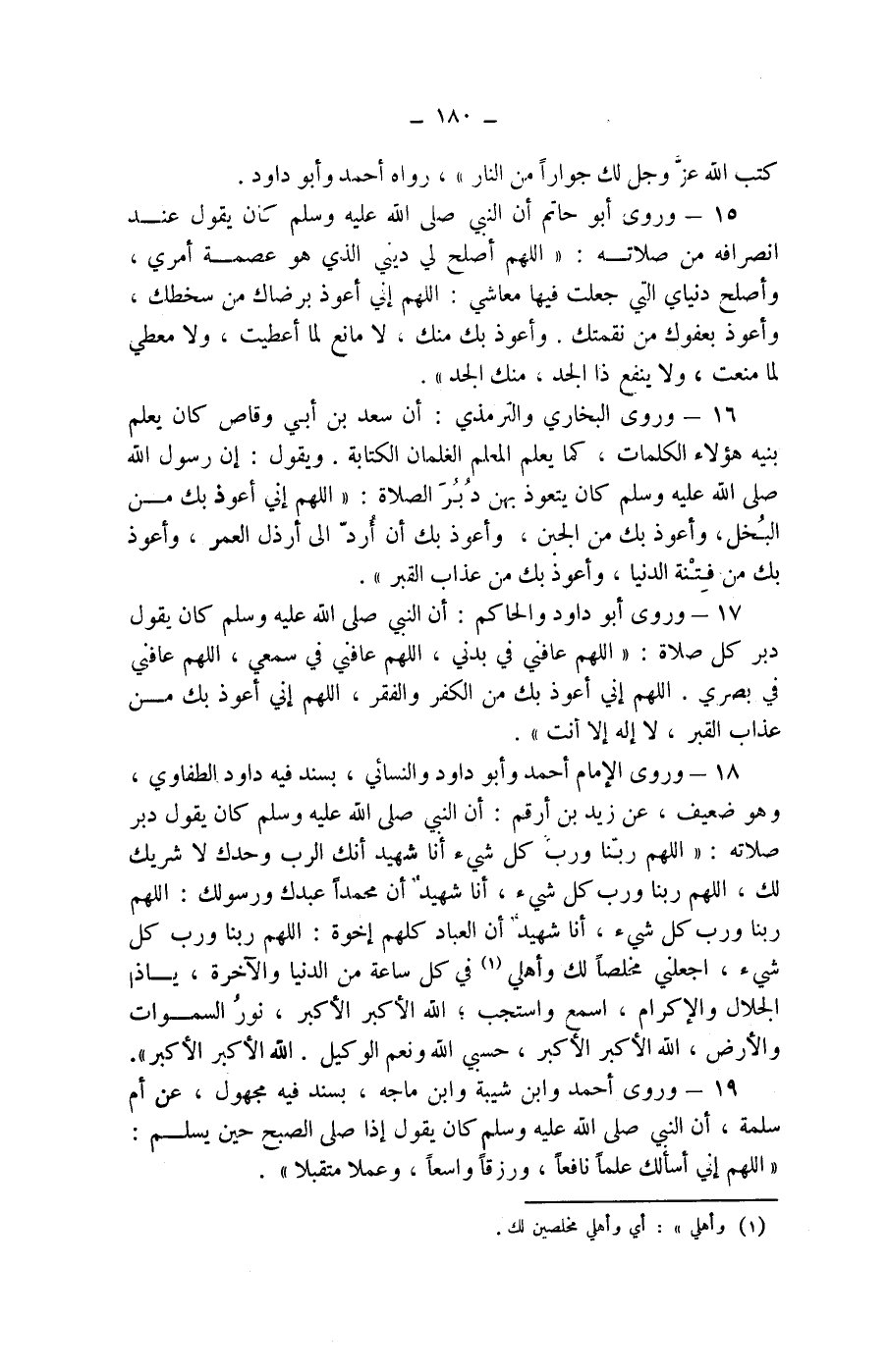 18 - وروى الامام أحمد وأبو داود والنسائي، بسند فيه داوند الطفاوي، وهو ضعيف، عن زيد بن أرقم: أن النبي صلى الله عليه وسلم كان يقول دبر صلاته: (اللهم ربنا ورب كل شئ أنا شهيد أنك الرب وحدك لا شريك لك، اللهم ربنا ورب كل شئ، أنا شهيد أن محمدا عبدك رسولك: اللهم ربنا ورب كل شئ، أنا شهيد أن العباد كلهم إخوة: اللهم ربنا ورب كل شئ، اجعلني مخلصا لك وأهلي (1) في كل ساعة من الدنيا والاخرة، يا ذا الجلال والاكرام، اسمع واستجب، الله الاكبر الاكبر، نور السموات والارض، الله الاكبر الاكبر، حسبي الله ونعم الوكيل.