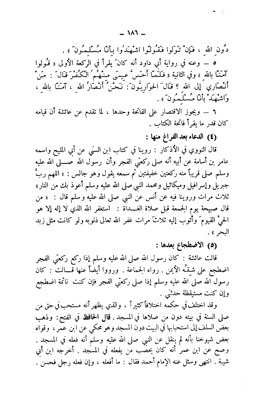 (4) الدعاء بعد الفراغ منها: قال النووي في الاذكار: روينا في كتاب ابن السني عن أبي المليح واسمه عامر بن أسامة عن أبيه أنه صلى ركعتي الفجر وأن رسول الله صلى الله عليه وسلم صلى قريبا منه ركعتين خفيفتين ثم سمعه يقول وهو جالس: (اللهم رب جبريل وإسرافيل وميكائيل ومحمد النبي صلى الله عليه وسلم أعوذ بك من النار) ثلاث مرات وروينا فيه عن أنس عن النبي صلى الله عليه وسلم قال: (من