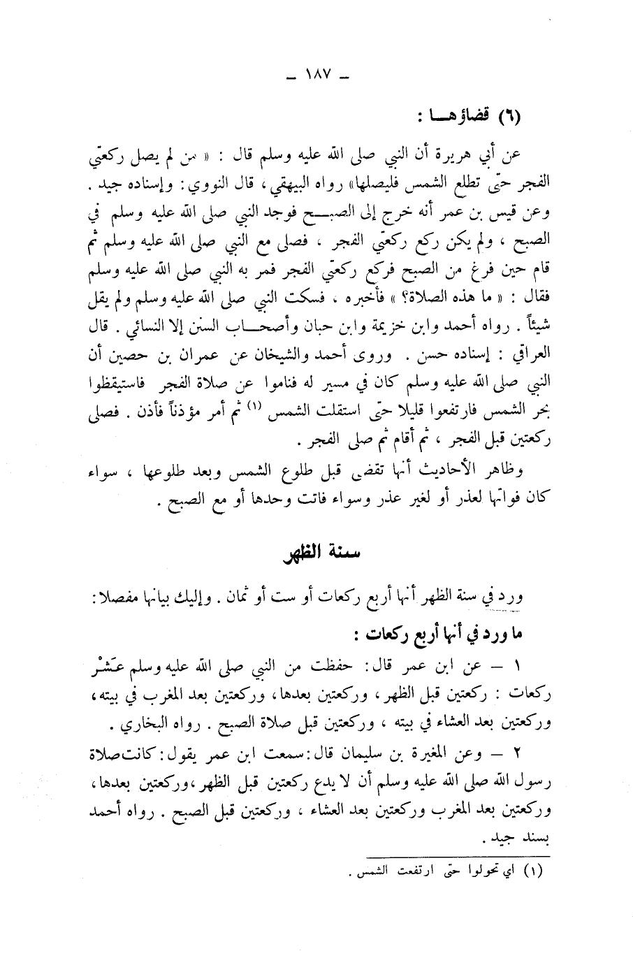 (6) قضاؤها: عن أبي هريرة أن النبي صلى الله عليه وسلم قال: (من لم يصل ركعتي الفجر حتى تطلع الشمس فليصلها) رواه البيهقي، قال النووي: وإسناده جيد.