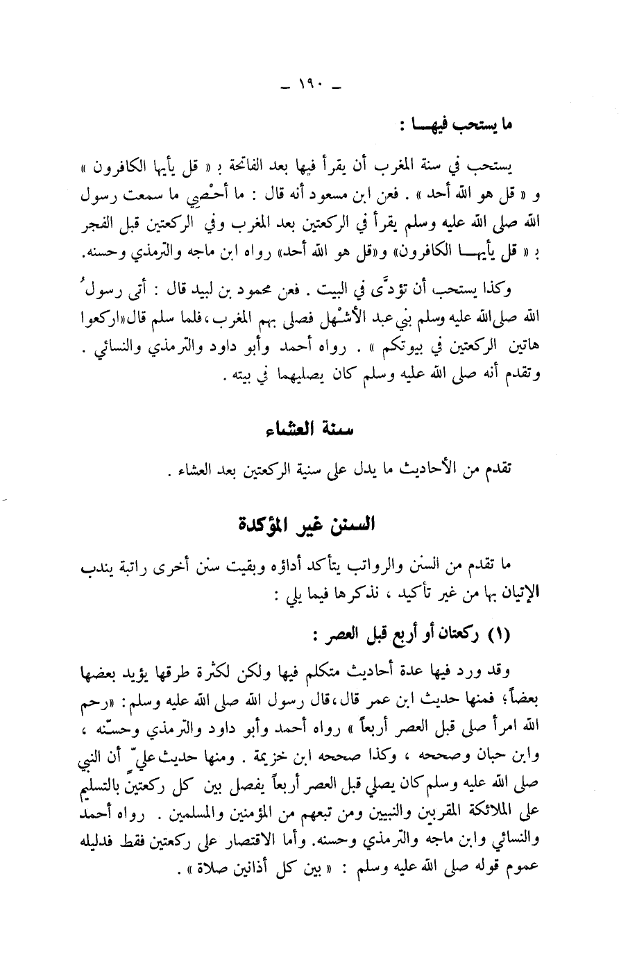 السنن غير المؤكدة ما تقدم من السنن والرواتب يتأكد أداؤه وبقيت سنن أخرى راتبة يندب الاتيان بها من غير تأكيد، نذكرها فيما يلي: (1) ركعتان أو أربع قبل العصر: وقد ورد فيها عدة أحاديث متكلم فيها ولكن لكثرة طرقها يؤيد بعضها بعضا، فمنها حديث ابن عمر قال، قال رسول الله صلى الله عليه وسلم: (رحم الله امرأ صلى قبل العصر أربعا) رواه أحمد وأبو داود والترمذي وحسنه، وابن حبان وصححه، وكذا صححه ابن خزيمة.