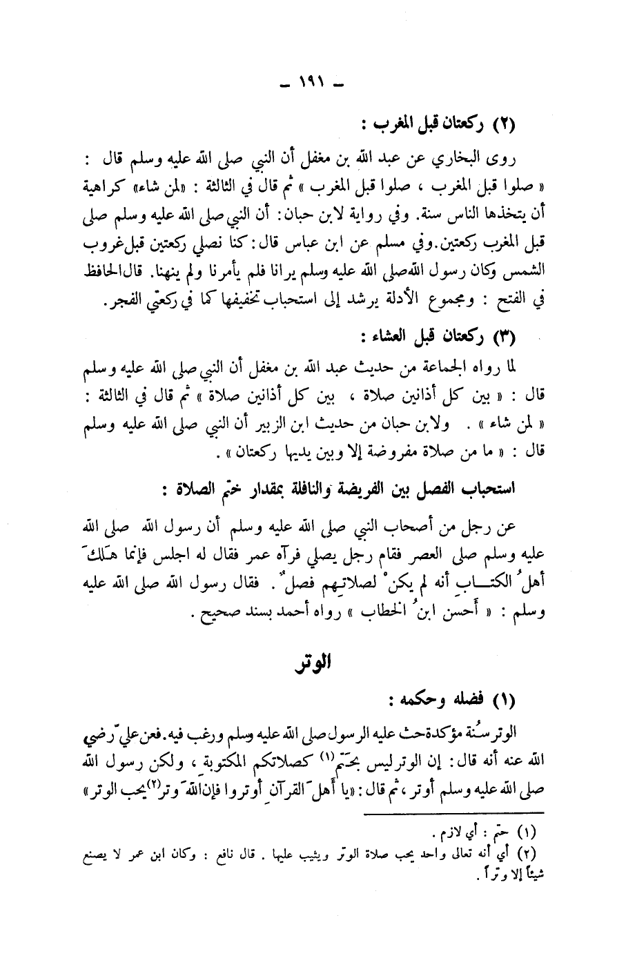 (1) فضله وحكمه: الوتر سنة مؤكدة حث عليه الرسول صلى الله عليه وسلم ورغب فيه.
