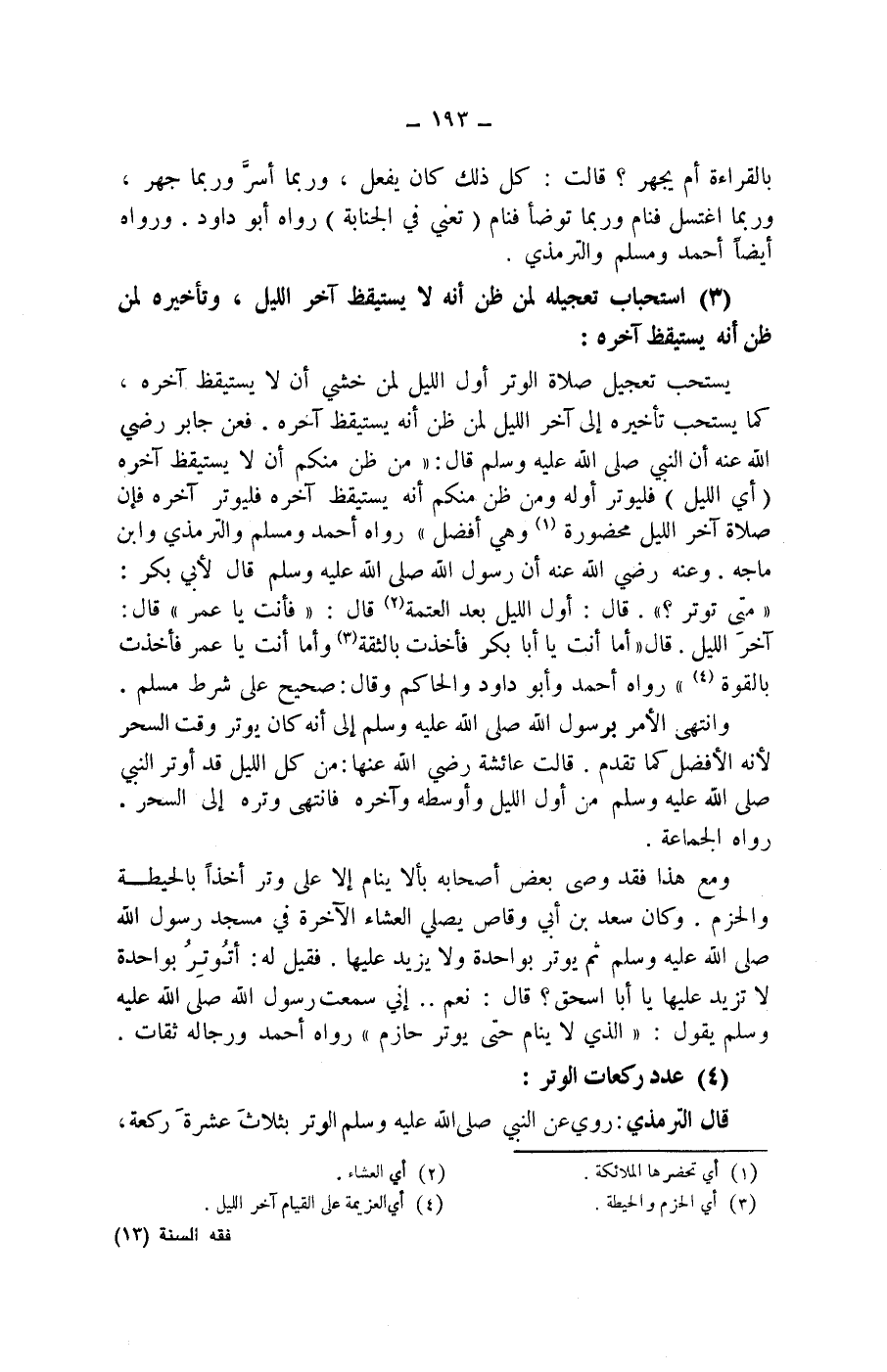 (4) عدد ركعات الوتر: قال الترمذي: روي عن النبي صلى الله عليه وسلم الوتر بثلاث عشرة ركعة،