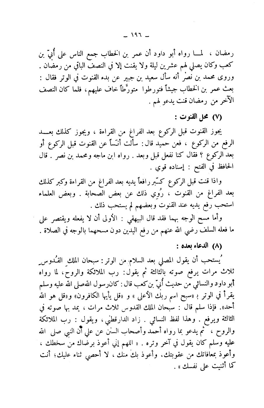 (7) محل القنوت: يجوز القنوت قبل الركوع بعد الفراغ من القراءة، ويجوز كذلك بعد الرفع من الركوع، فعن حميد قال: سألت أنسا عن القنوت قبل الركوع أو بعد الركوع؟ فقال كنا نفعل قبل وبعد. رواه ابن ماجه ومحمد بن نصر.