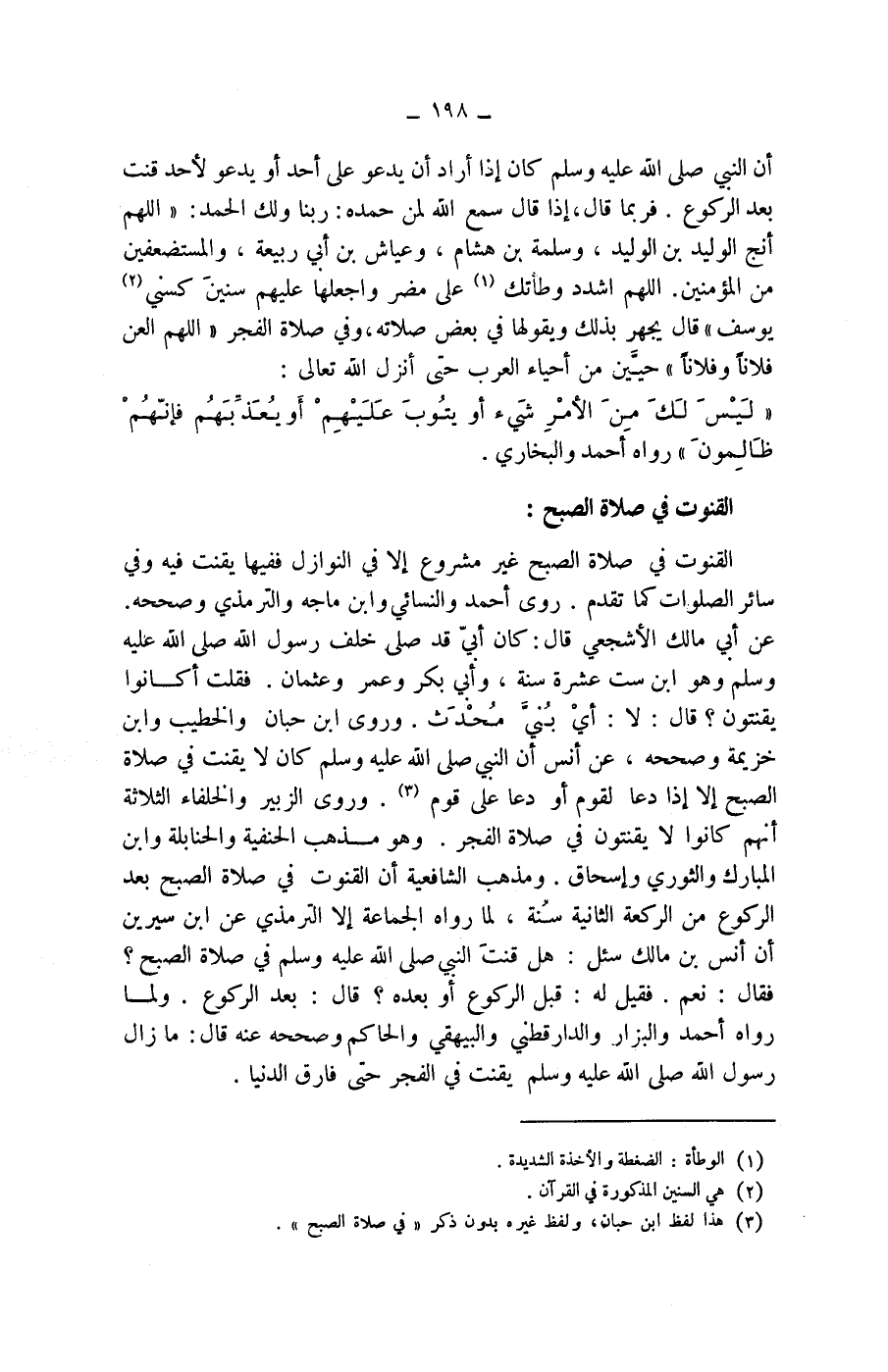 وروى ابن حبان والخطيب وابن خزيمة وصححه، عن أنس أن النبي صلى الله عليه وسلم كان لا يقنت في صلاة الصبح إلا إذا دعا لقوم أو دعا على قوم (3) .