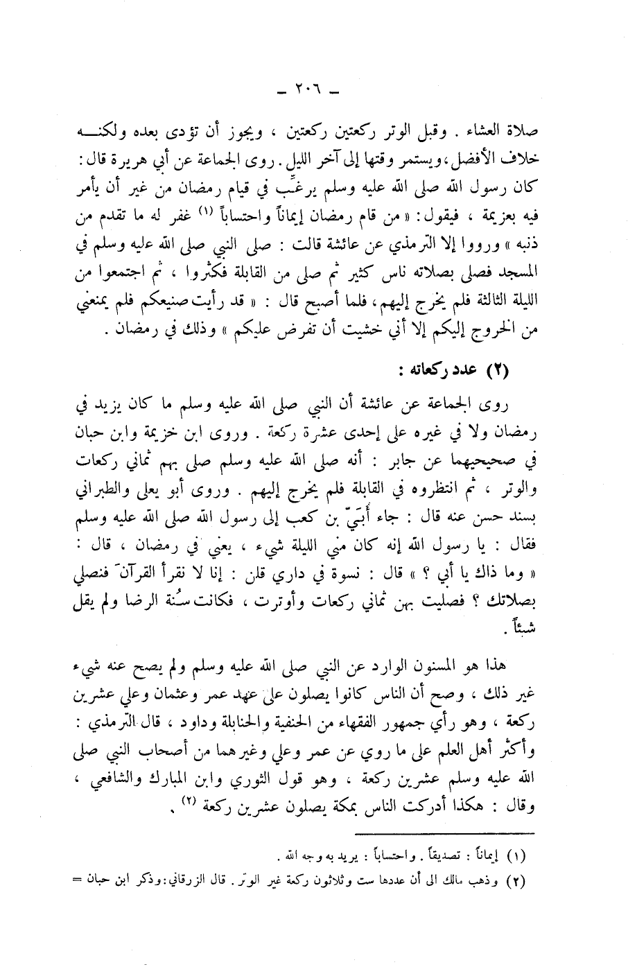 ذا هو المسنون الوارد عن النبي صلى الله عليه وسلم ولم يصح عنه شئ غير ذلك، وصح أن الناس كانوا يصلون على عهد عمر وعثمان وعلي عشرين ركعة، وهو رأي جمهور الفقهاء من الحنفية والحنابلة وداود، قال الترمذي: وأكثر أهل العلم على ما روي عن عمر وعلي وغيرهما من أصحاب النبي صلى الله عليه وسلم عشرين ركعة، وهو قول الثوري وابن المبارك والشافعي، وقال: هكذا أدركت الناس بمكة يصلون عشرين ركعة (2)