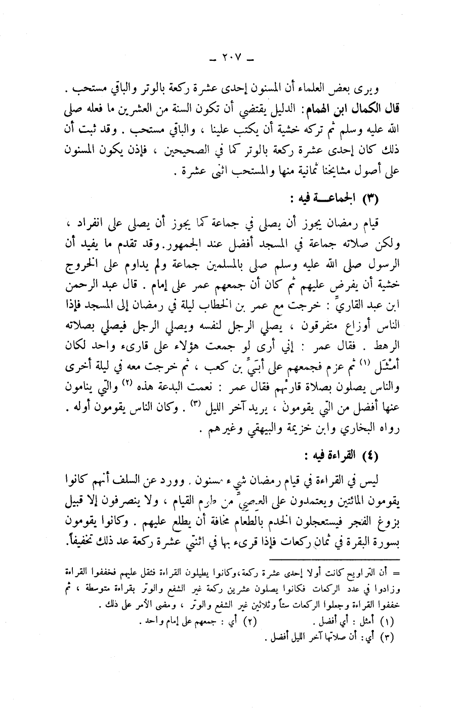 (4) القراءة فيه: ليس في القراءة في قيام رمضان شئ مسنون، وورد عن السلف أنهم كانوا يقومون المائتين ويعتمدون على العصي من طوم القيام، ولا ينصرفون إلا قبيل بزوغ الفجر فيستعجلون الخدم بالطعام مخافة أن يطلع عليهم.