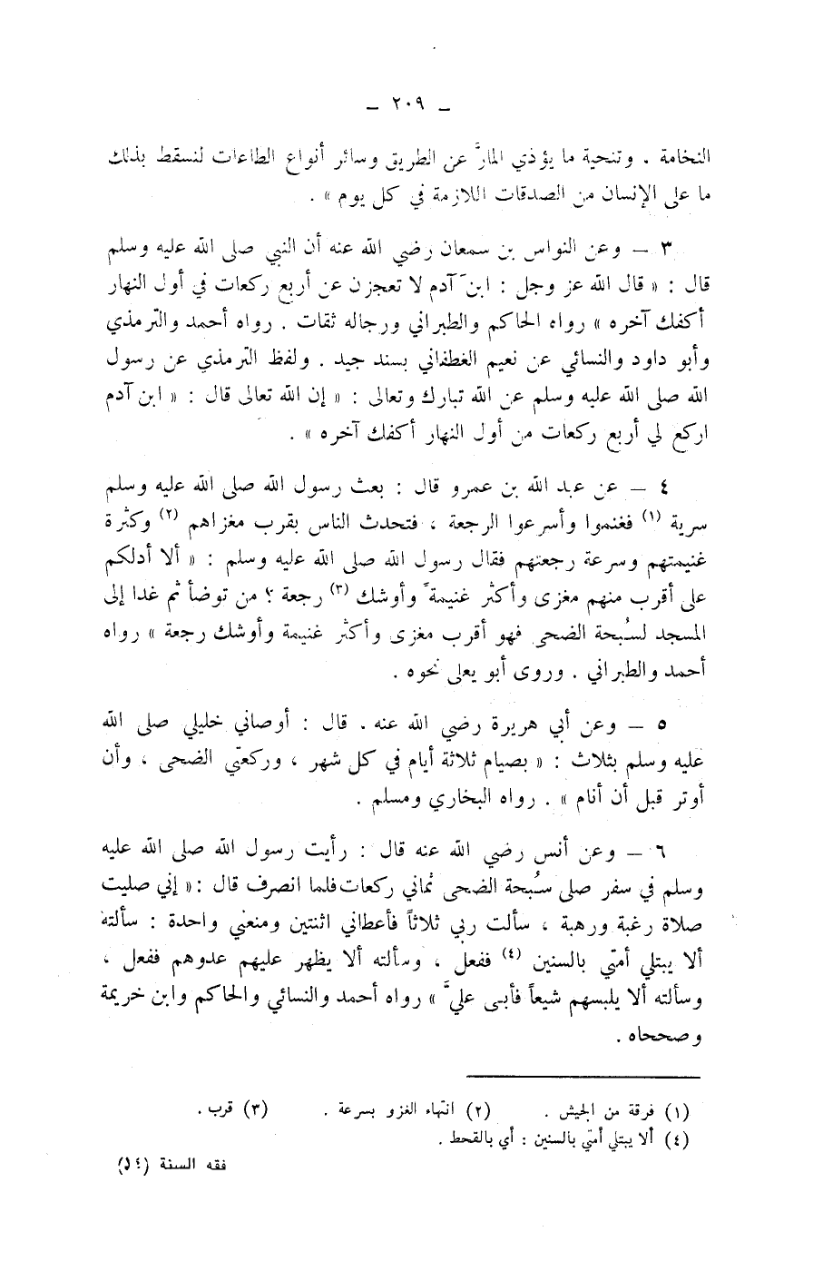 4 - عن عبد الله بن عمرو قال: بعث رسول الله صلى الله عليه وسلم سرية (1) فغنموا وأسرعوا الرجعة، فتحدث الناس بقرب مغزاهم (2) وكثرة غنيمتهم وسرعة رجعتهم فقال رسول الله صلى الله عليه وسلم: (ألا أدلكم على أقرب منهم مغزى وأكثر غنيمة وأوشك (3) رجعة؟ من توضأ ثم غدا إلى المسجد لسبحة الضحى فهو أقرب مغزى وأكثر غنيمة وأوشك رجعة) رواه أحمد والطبراني.