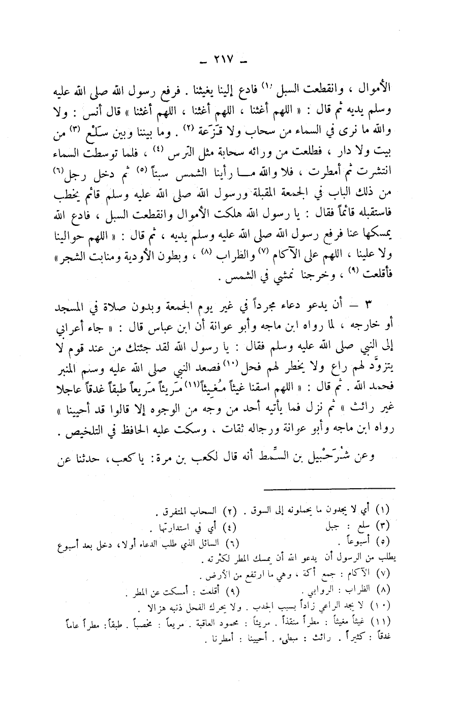 فرفع رسول الله صلى الله عليه وسلم يديه ثم قال: (اللهم أغثنا، اللهم أغثنا، اللهم أغثنا) قال أنس: ولا والله ما نرى في السماء من سحاب ولا قزعة (2) . وما بيننا وبين سلع (3) من بيت ولا دار، فطلعت من ورائه سحابة مثل الترس (4) ، فلما توسطت السماء انتشرت ثم أمطرت، فلا والله ما رأينا الشمس سبتا (5) ثم دخل رجل (6) من ذلك الباب في الجمعة المقبلة ورسول الله صلى الله عليه وسلم قائم يخطب فاستقبله قائما فقال: يا رسول الله هلكت الاموال وانقطعت السبل، فادع الله يمسكها عنا فرفع رسول الله صلى الله عليه وسلم يديه، ثم قال: (اللهم حوالينا ولا علينا، اللهم على الاكام (7) والظراب (8) ، وبطون الاودية ومنابت الشجر) فأقلعت (9) ، وخرجنا نمشي في الشمس.