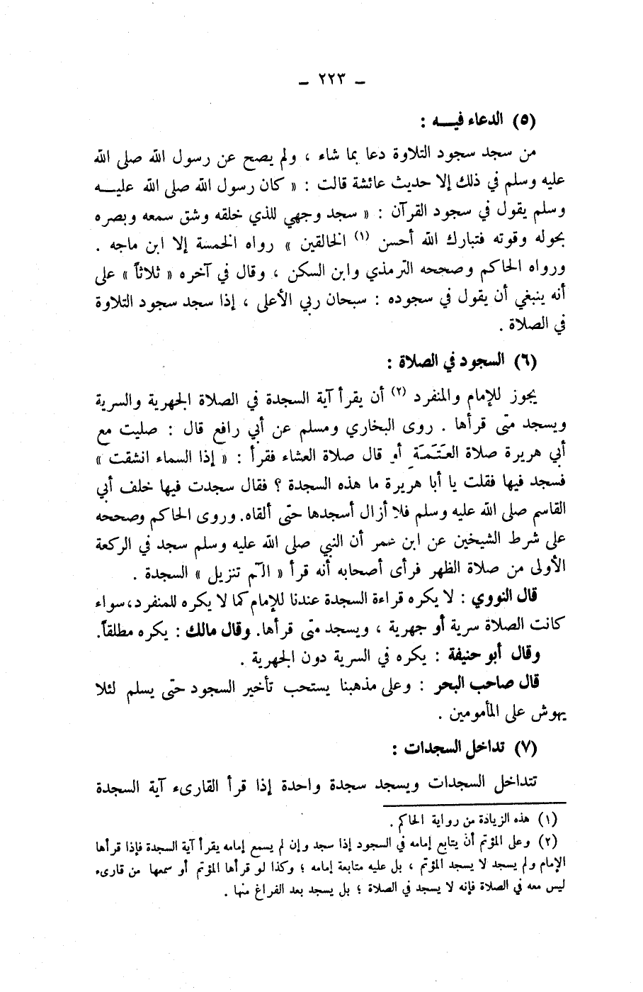 (6) السجود في الصلاة: يجوز للامام والمنفرد (2) أن يقرأ آية السجدة في الصلاة الجهرية والسرية ويسجد متى قرأها.
