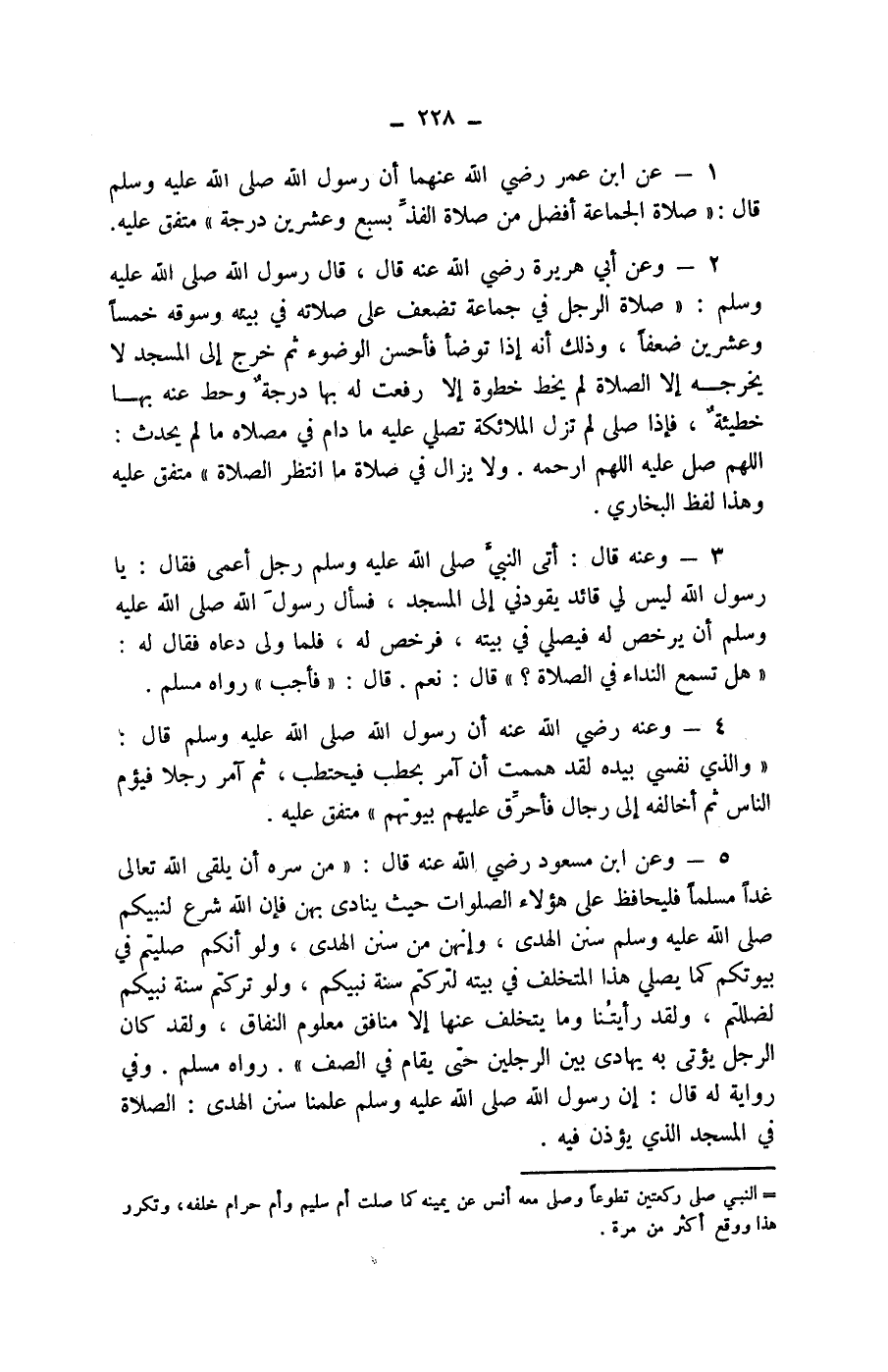 1 - عن ابن عمر رضي الله عنهما أن رسول الله صلى الله عليه وسلم قال: (صلاة الجماعة أفضل من صلاة الفذ بسبع وعشرين درجة) متفق عليه.