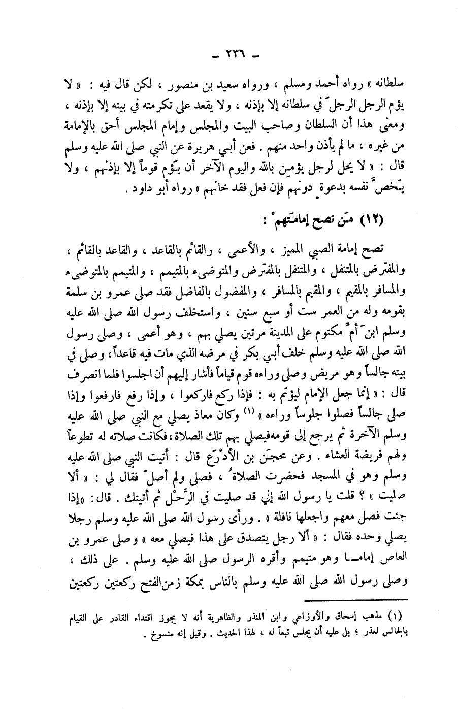 سلطانه) رواه أحمد ومسلم، ورواه سعيد بن منصور، لكن قال فيه: (لا يؤم الرجل الرجل في سلطانه إلا بإذنه، ولا يقعد على تكرمته في بيته إلا بإذنه، ومعنى هذا أن السلطان وصاحب البيت والمجلس وإمام المجلس أحق بالامامة من غيره، ما لم يأذن واحد منهم.