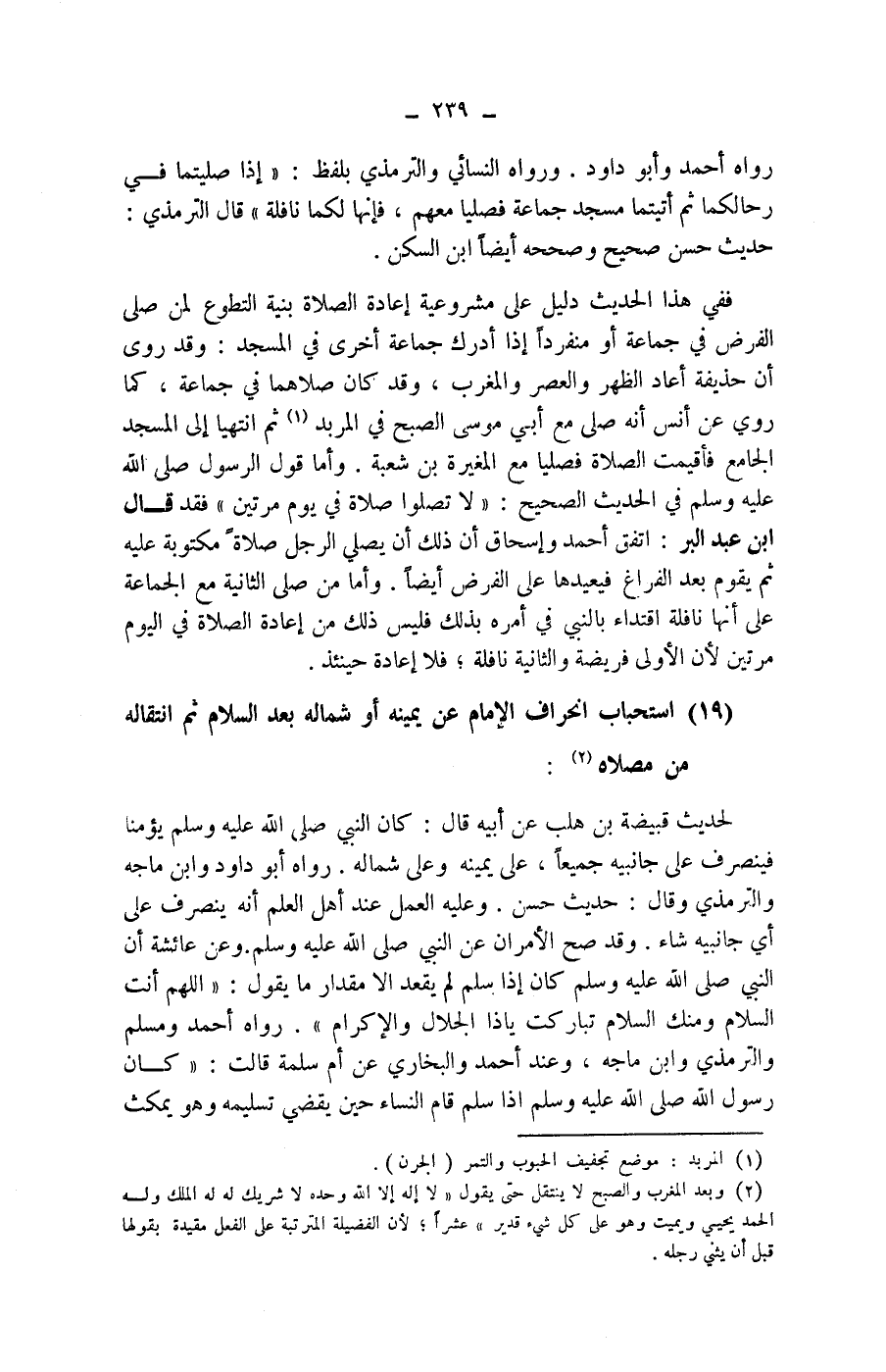 (19) استحباب انحراف الامام عن يمينه أو شماله بعد السلام ثم انتقاله من مصلاه (2) :