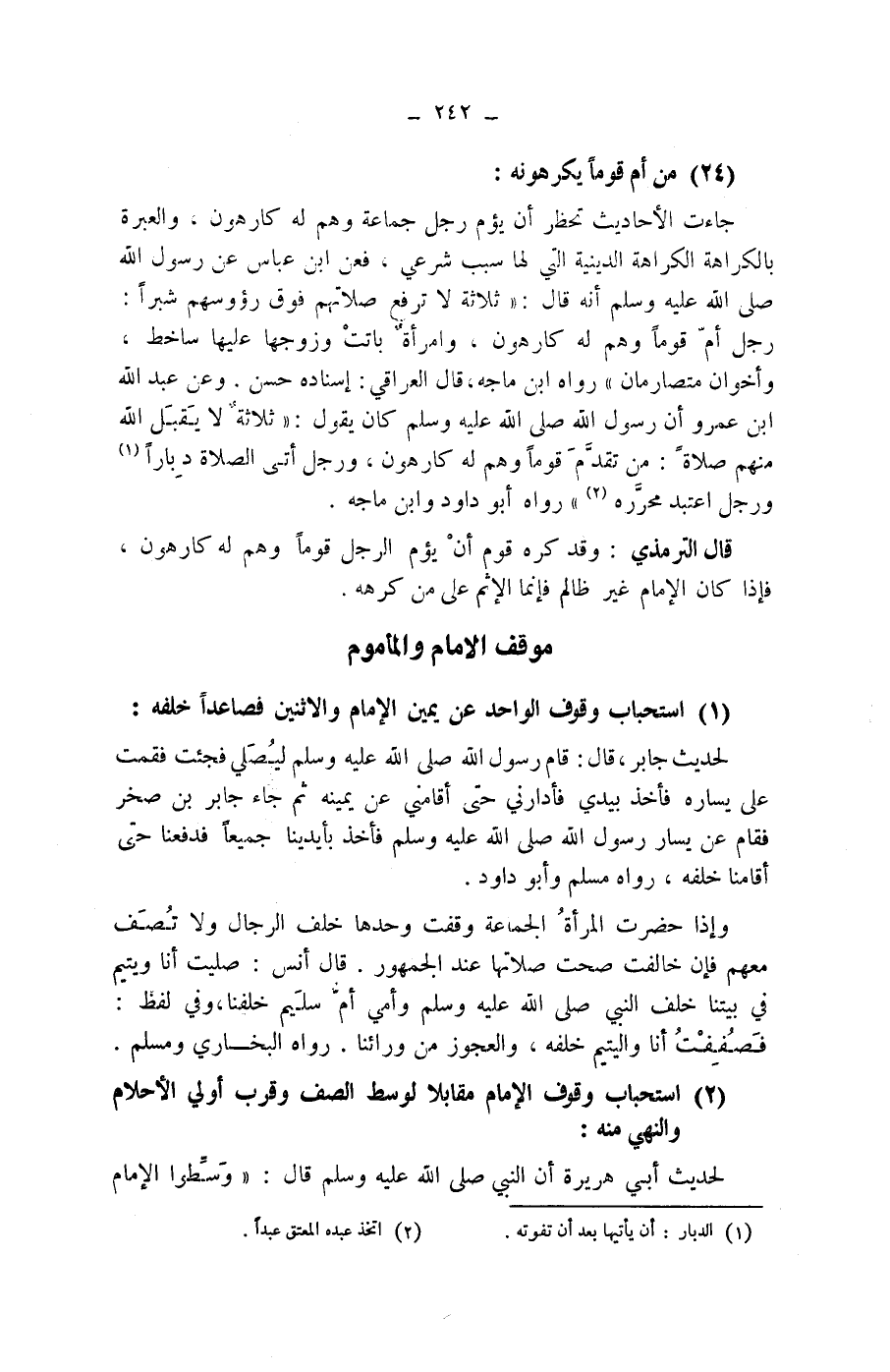 وعن عبد الله بن عمرو أن رسول الله صلى الله عليه وسلم كان يقول: (ثلاثة لا يقبل الله منهم صلاة: من تقدم قوما وهم له كارهون، ورجل أتى الصلاة دبارا (1) ورجل اعتبد محرره (2)) رواه أبو داود وابن ماجه.