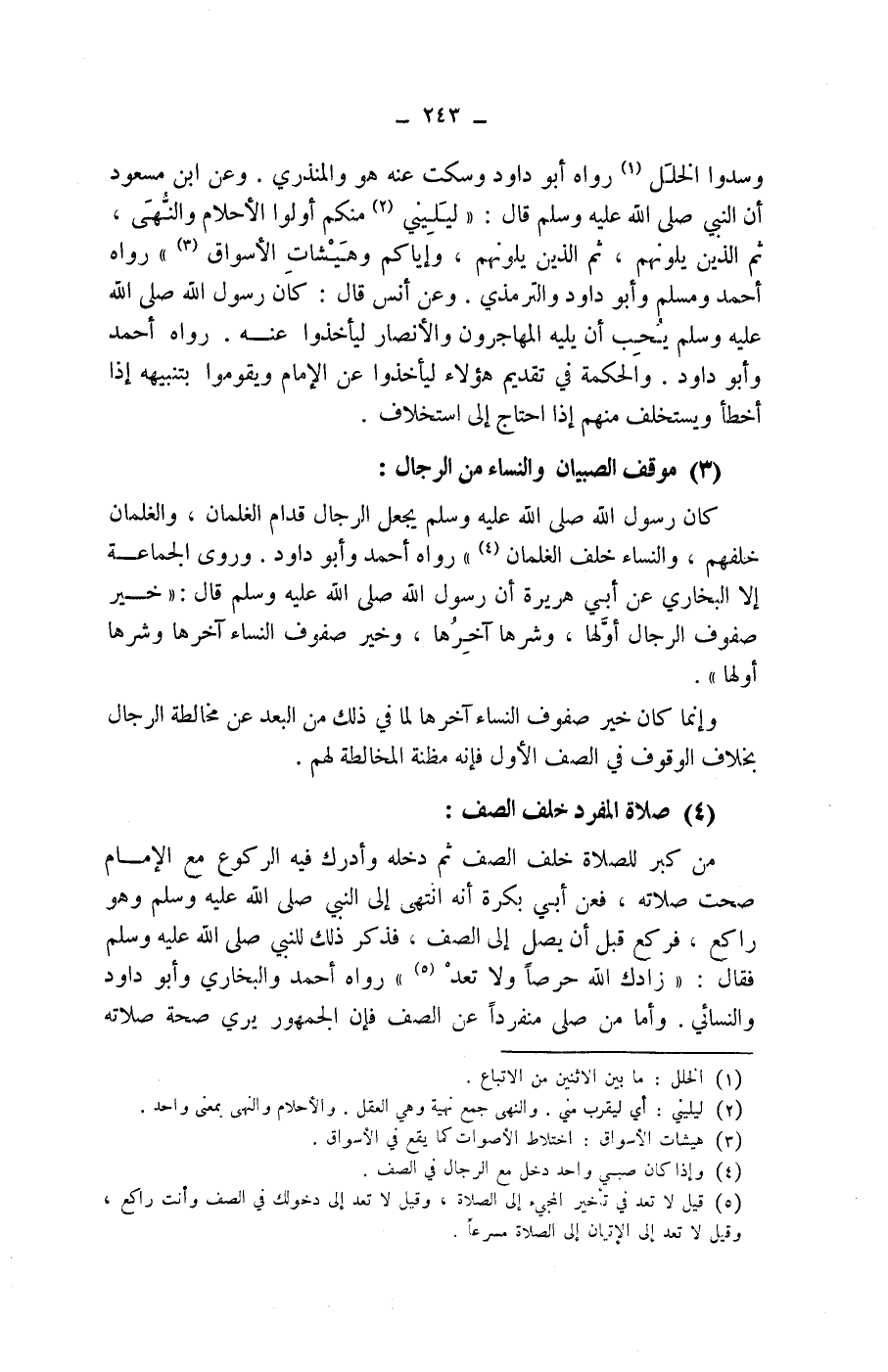 (3) موقف الصبيان والنساء من الرجال: كان رسول الله صلى الله عليه وسلم يجعل الرجال قدام الغلمان، والغلمان خلفهم، والنساء خلف الغلمان (4)) رواه أحمد وأبو داود.