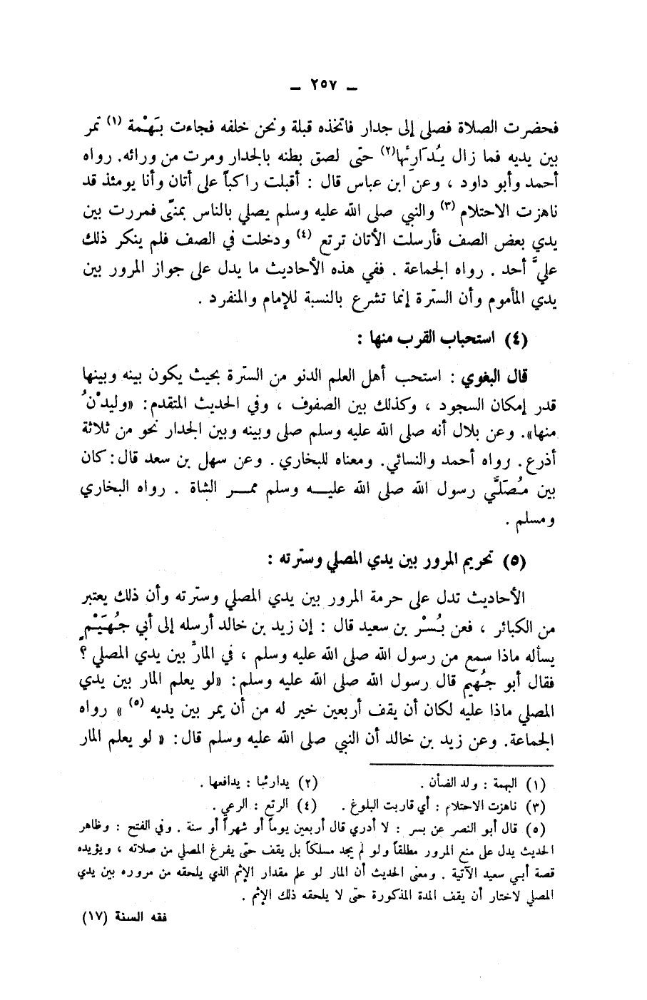 (5) قال أبو النصر عن بسر: لا أدري قال أربعين يوما أو شهرا أو سنة. وفي الفتح: وظاهر الحديث يدل على منع المرور مطلقا ولو لم يجد مسلكا بل يقف حتى يفرغ المصلي من صلاته، ويؤيده قصة أبي سعيد الاتية. ومعنى الحديث أن المار لو علم مقدار الاثم الذي يلحقه من مروره بين يدي المصلي لاختار أن يقف المدة المذكورة حتى لا يلحقه ذلك الاثم.