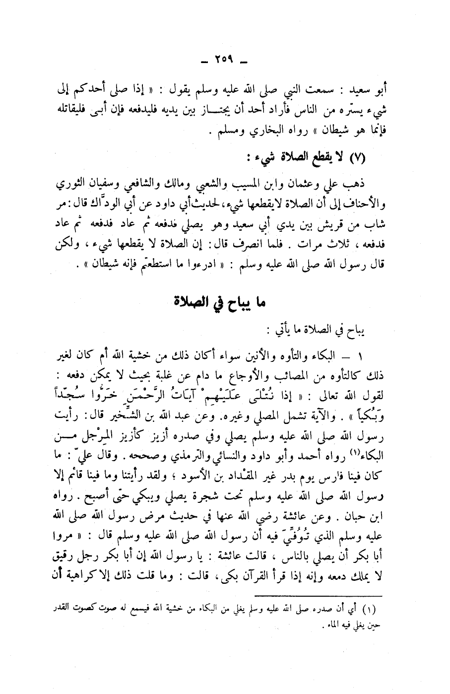 (7) لا يقطع الصلاة شئ: ذهب علي وعثمان وابن المسيب والشعبي ومالك والشافعي وسفيان الثوري والاحناف إلى أن الصلاة لا يقطعها شئ، لحديث أبي داود عن أبي الوداك قال: مر شاب من قريش بين يدي أبي سعيد وهو يصلي فدفعه ثم عاد فدفعه ثم عاد فدفعه، ثلاث مرات.