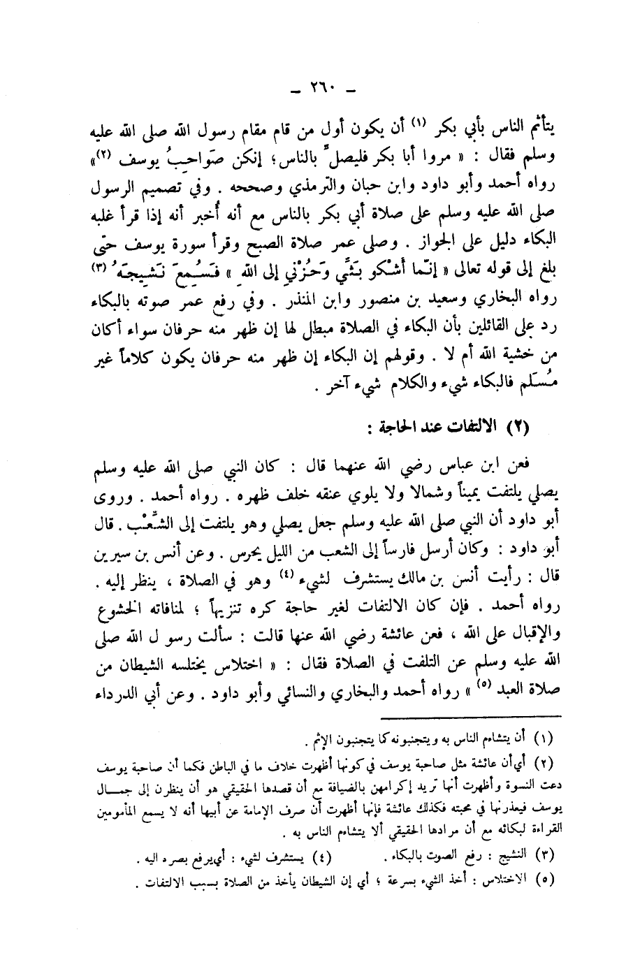 (2) الالتفات عند الحاجة: فعن ابن عباس رضي الله عنهما قال: كان النبي صلى الله عليه وسلم يصلي يلتفت يمينا وشمالا ولا يلوي عنقه خلف ظهره. رواه أحمد.