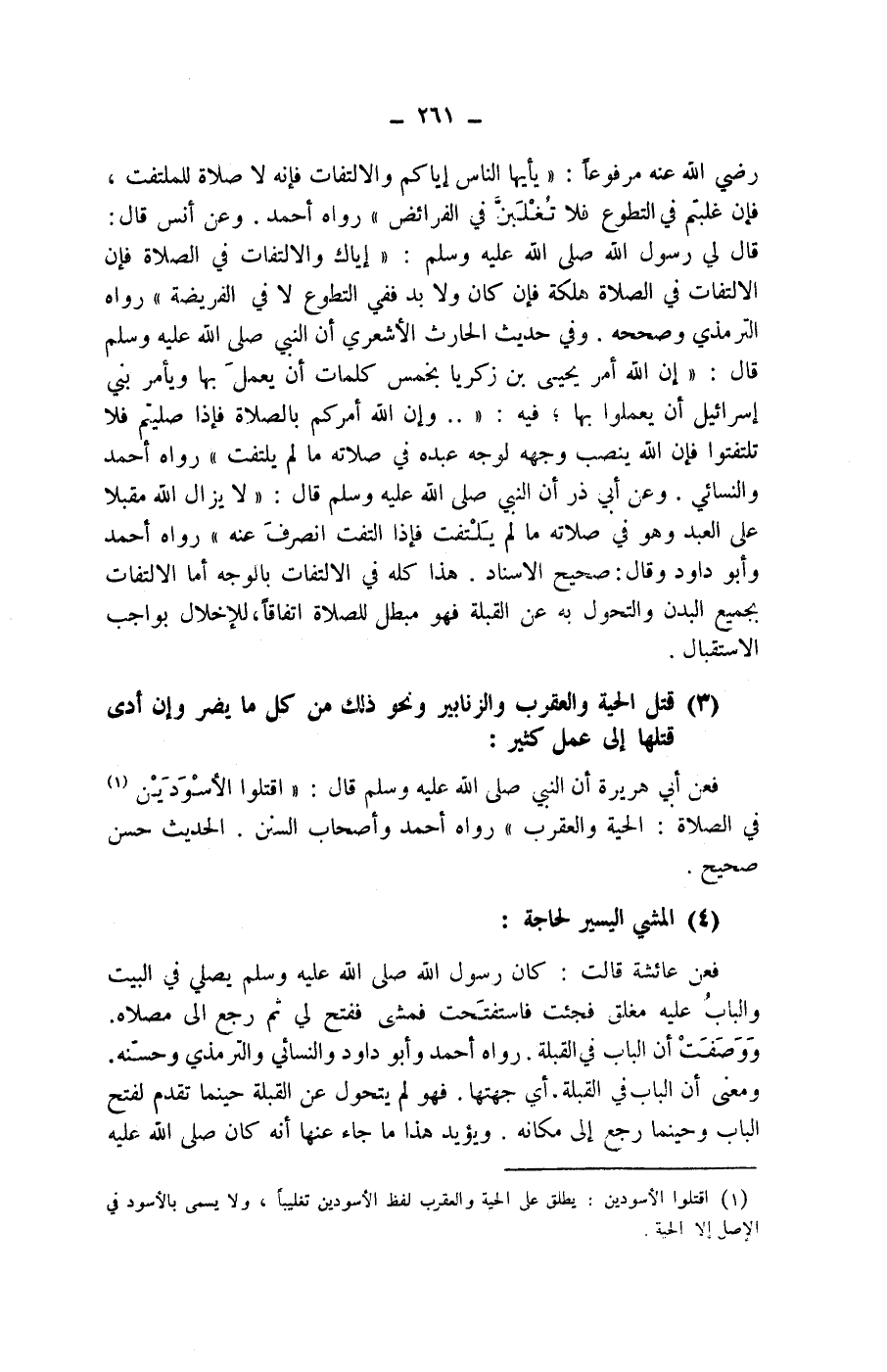 (3) قتل الحية والعقرب والزنابير ونحو ذلك من كل ما يضر وإن أدى قتلها إلى عمل كثير: فعن أبي هريرة أن النبي صلى لاله عليه وسلم قال: (اقتلوا الاسودين (1) في الصلاة: الحية والعقرب) رواه أحمد وأصحاب السنن. الحديث حسن صحيح.