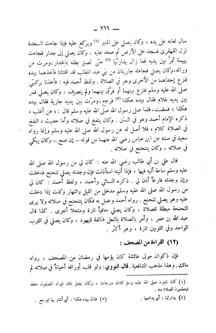 (12) القراءة من المصحف: فإن ذكوان مولى عائشة كان يؤمها في رمضان من المصحف، رواه مالك. وهذا مذهب الشافعية.