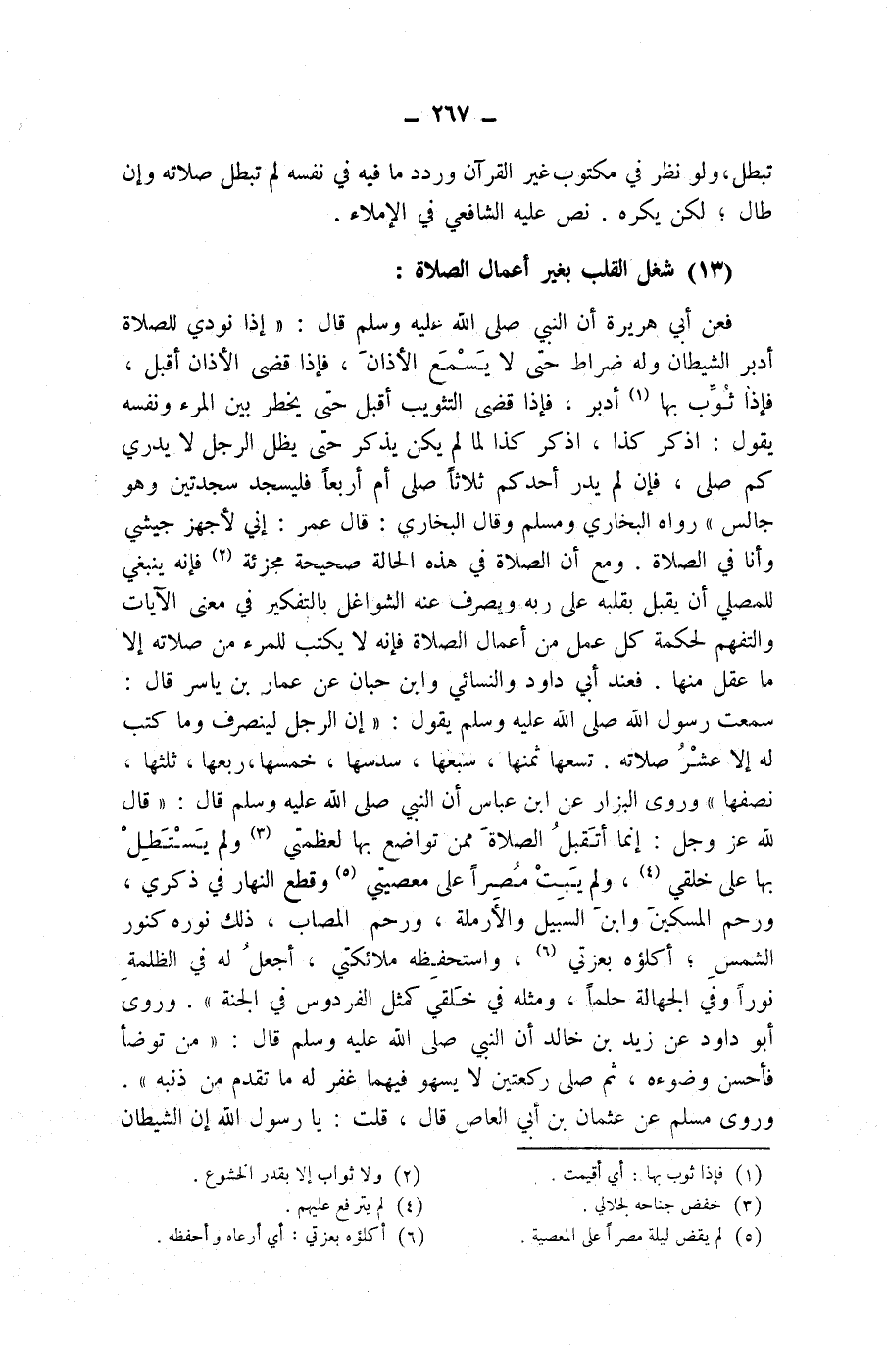 (13) شغل القلب بغير أعمال الصلاة: فعن أبي هريرة أن النبي صلى الله عليه وسلم قال: (إذا نودي للصلاة أدبر الشيطان وله ضراط حتى لا يسمع الاذان، فإذا قضى الاذان أقبل، فإذا ثوب بها (1) أدبر، فإذا قضى التثويب أقبل حتى يخطر بين المرء ونفسه يقول: اذكر كذا، اذكر كذا لما لم يكن يذكر حتى يظن الرجل لا يدري كم صلى، فإن لم يدر أحدكم ثلاثا صلى أم أربعا فليسجد سجدتين وهو جالس) رواه البخاري ومسلم وقال البخاري: قال عمر: إني لاجهز جيشي وأنا في الصلاة.