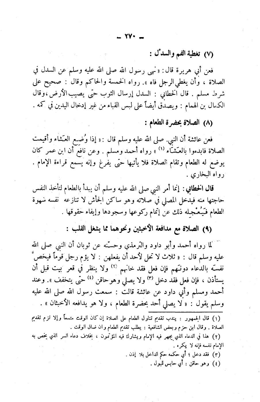(7) تغطية الفم والسدل: فعن أبي هريرة قال: (نهى رسول الله صلى الله عليه وسلم عن السدل في الصلاة، وأن يغطي الرجل فاه) .