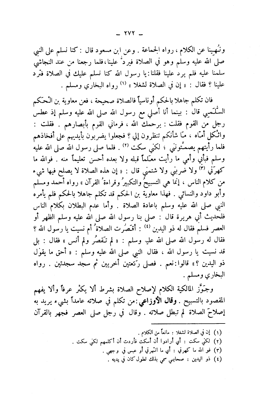 وأما عدم البطلان بكلام الناس فلحديث أبي هريرة قال: صلى بنا رسول الله صلى الله عليه وسلم الظهر أو العصر فسلم فقال له ذو اليدين (4) : أقصرت الصلاة أم نسيت يا رسول الله؟ فقال له رسول الله صلى الله عليه وسلم: (لم تقصر ولم أنس) فقال: بل