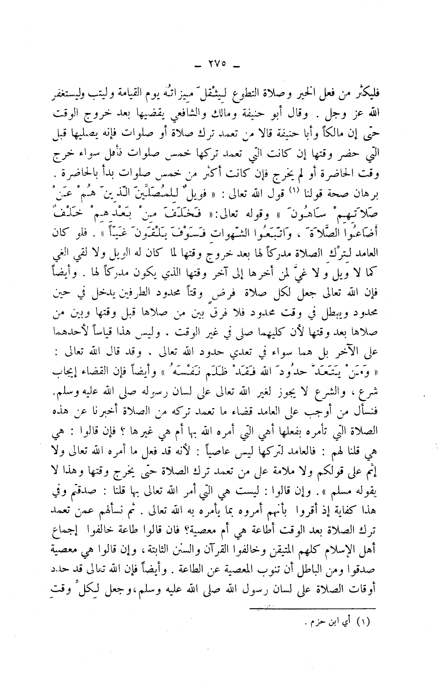 فنسأل من أوجب على العامد قضاء ما تعمد تركه من الصلاة أخبرنا عن هذه الصلاة التي تأمره بفعلها أهي التي أمره الله بها أم هي غيرها؟ فإن قالوا: هي هي قلنا لهم: فالعامد لتركها ليس عاصيا: لانه قد فعل ما أمره الله تعالى ولا إثم على قولكم ولا ملامة على من تعمد ترك الصلاة حتى يخرج وقتها وهذا لا يقوله مسلم) .
