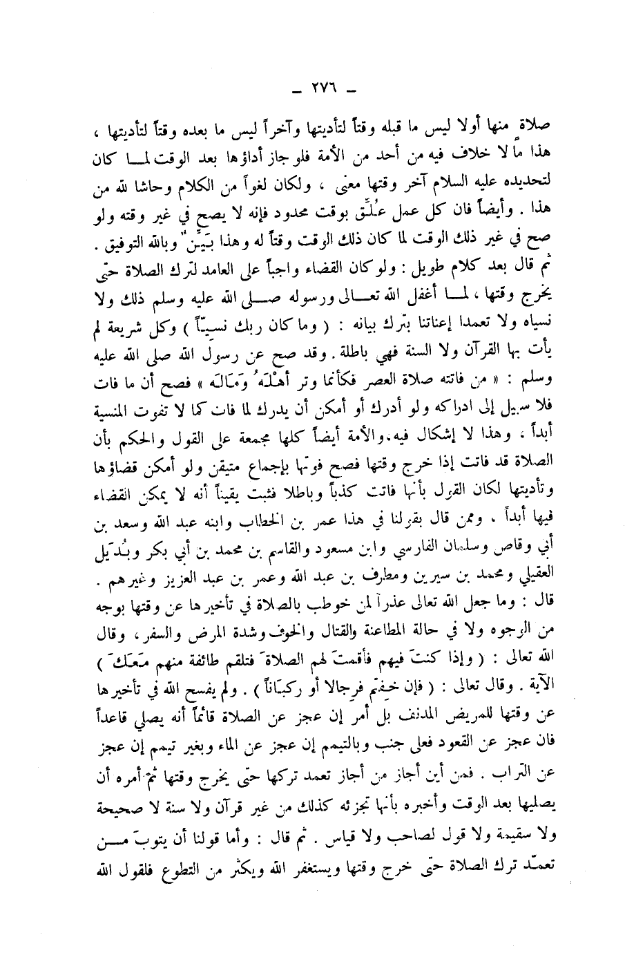 قال: وما جعل الله تعالى عذرا لمن خوطب بالصلاة في تأخيرها عن وقتها بوجه من الوجوه ولا في حالة المطاعنة والقتال والخوف وشدة المرض والسفر، وقال الله تعالى: (وإذا كنت فيهم فأقمت لهم الصلاة فتلقم طائفة منكم معك) الاية. وقال تعالى: (فإن خفتم فرجالا أو ركبانا) .