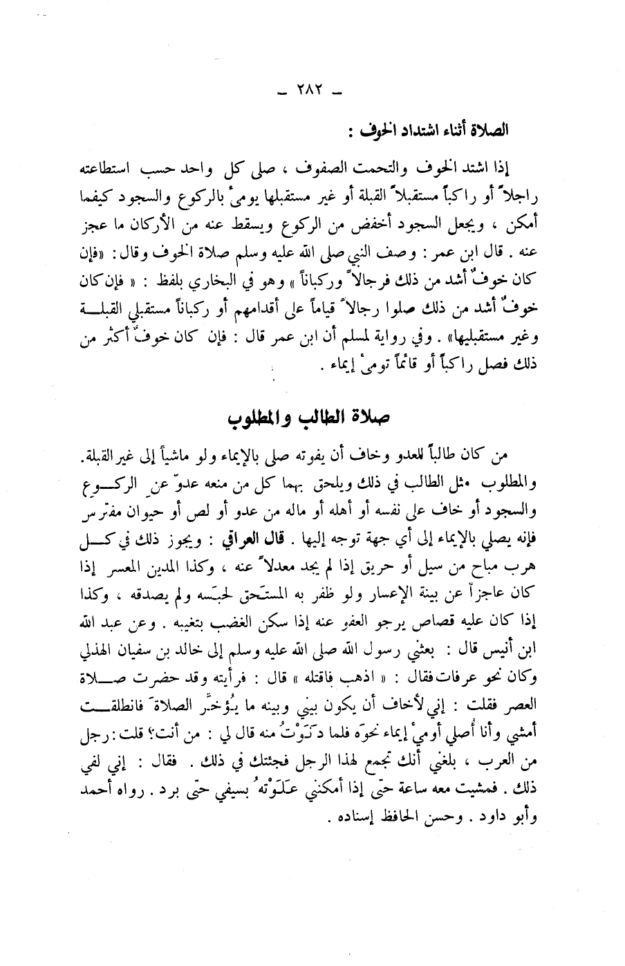 قال ابن عمر: وصف النبي صلى الله عليه وسلم صلاة الخوف وقال: (فإن كان خوف أشد من ذلك فرجالا وركبانا) وهو في البخاري بلفظ: (فإن كان خوف أشد من ذلك صلوا رجالا قياما على أقدامهم أو ركبانا مستقبلي القبلة وغير مستقبليها) وفي رواية لمسلم أن ابن عمر قال: فإن كان خوف أكثر من ذلك فصل راكبا أو قائما تومئ إيماء.