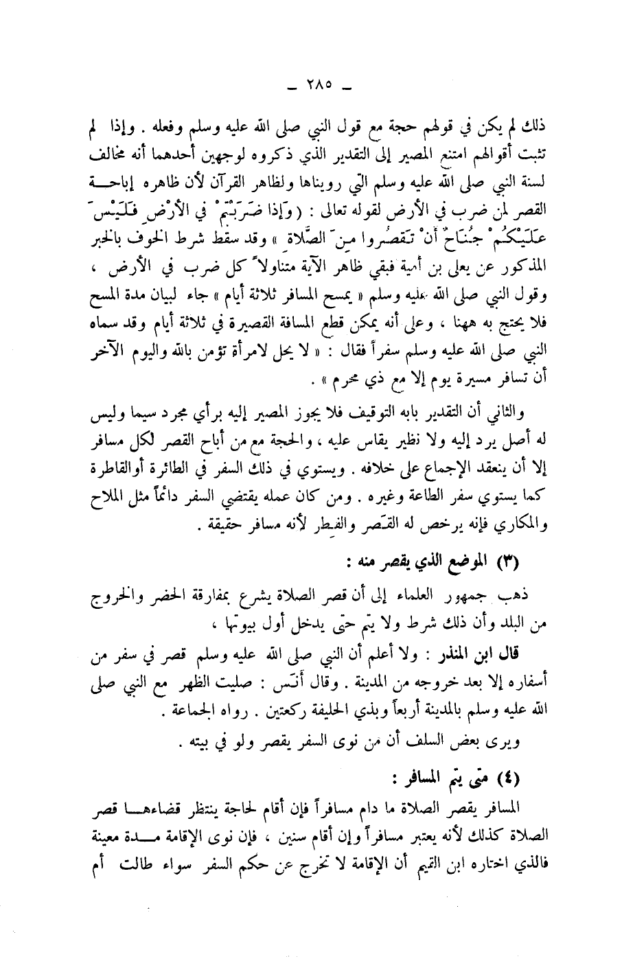 (4) متى يتم المسافر: المسافر يقصر الصلاة ما دام مسافرا فإن أقام لحاجة ينتظر قضاءها قصر الصلاة كذلك لانه يعتبر مسافرا وإن أقام سنين، فإن نوى الاقامة مدة معينة فالذي اختاره ابن القيم أن الاقامة لا تخرج عن حكم السفر سواء طالت أم
