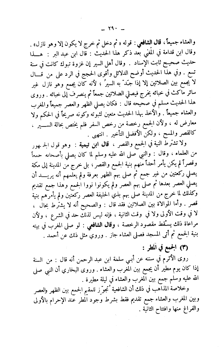 (3) الجمع في المطر: روى الاثرم في سننه عن أبي سلمة ابن عبد الرحمن أنه قال: من السنة إذا كان يوم مطير أن يجمع بين المغرب والعشاء.
