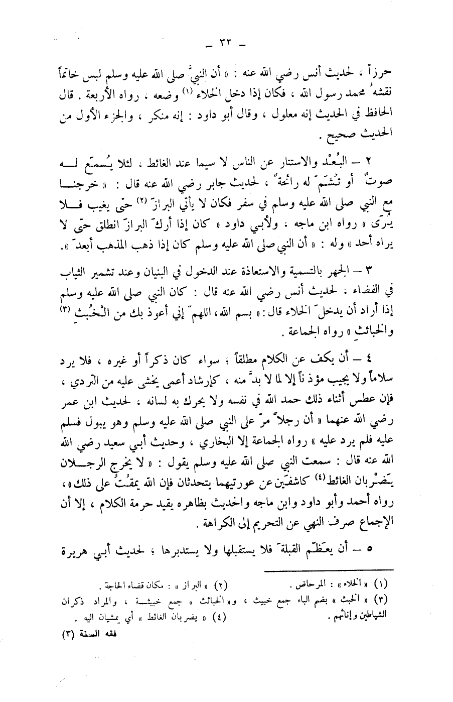 رضي الله عنهما (أن رجلا مر على النبي صلى الله عليه وسلم وهو يبول فسلم عليه فلم يرد عليه) رواه الجماعة إلا البخاري، وحديث أبي سعيد رضي الله عنه قال: سمعت النبي صلى الله عليه وسلم يقول: (لا يخرج الرجلان يضربان الغائط (4) كاشفين عن عورتيهما يتحدثان فإن الله يمقت على ذلك) رواه أحمد وأبو داود وابن ماجه والحديث بظاهره يقيد حرمة الكلام، إلا أن الاجماع صرف النهي عن التحريم إلى الكراهة.