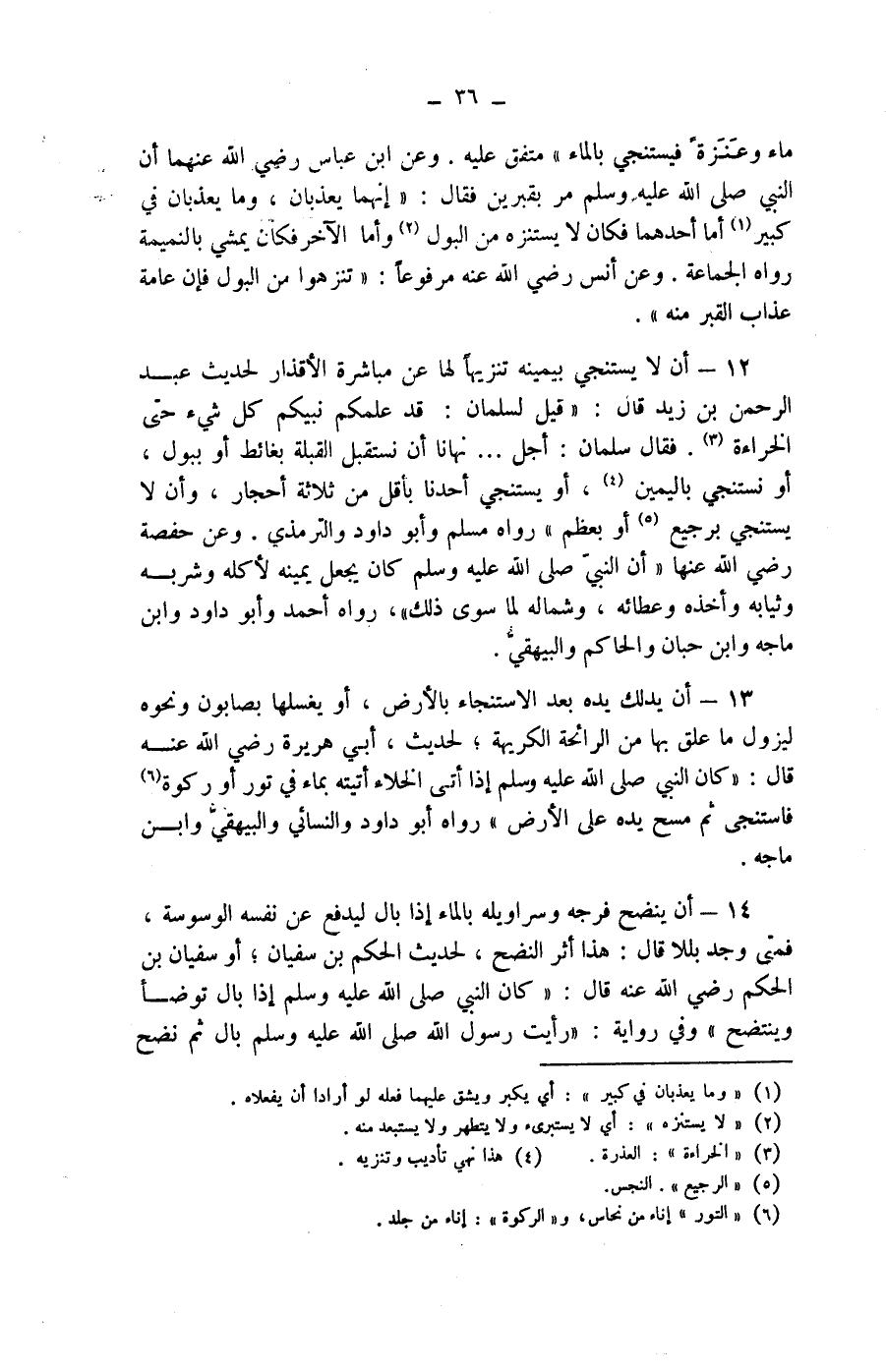 12 - أن لا يستنجي بيمينه تنزيها لها عن مباشرة الاقذار لحديث عبد الرحمن بن زيد قال: (قيل لسلمان: قد علمكم نبيكم كل شئ حتى الخراءة (3) . فقال سلمان: أجل ... نهانا أن نستقبل القبلة بغائط أو ببول، أو نستنجي باليمين (4) ، أو يستنجي أحدنا بأقل من ثلاثة أحجار، وأن لا يستنجي برجيع (5) أو بعظم) رواه مسلم وأبو داود والترمذي.