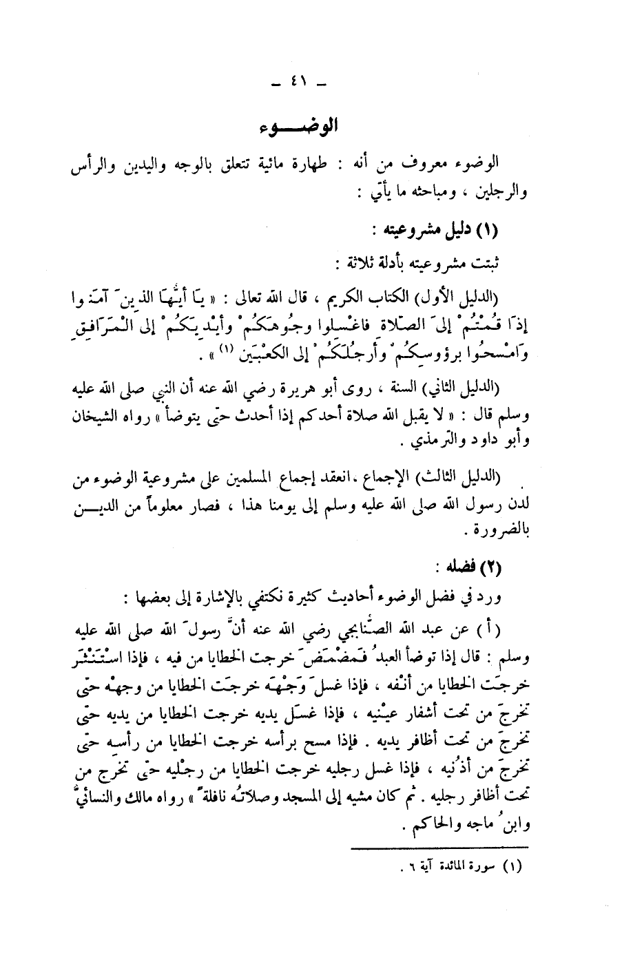 الوضوء معروف من أنه: طهارة مائية تتعلق بالوجه واليدين والرأس والرجلين، ومباحثه ما يأتي: