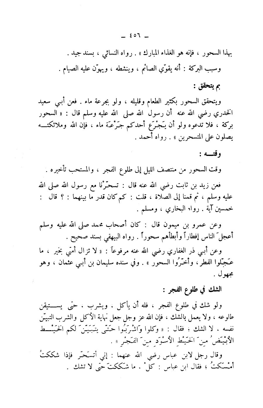 وقال رجل لابن عباس رضي الله عنهما: إني أتسحر فإذا شككت أمسكت، فقال ابن عباس: كل، ما شككت حتى لا تشك.