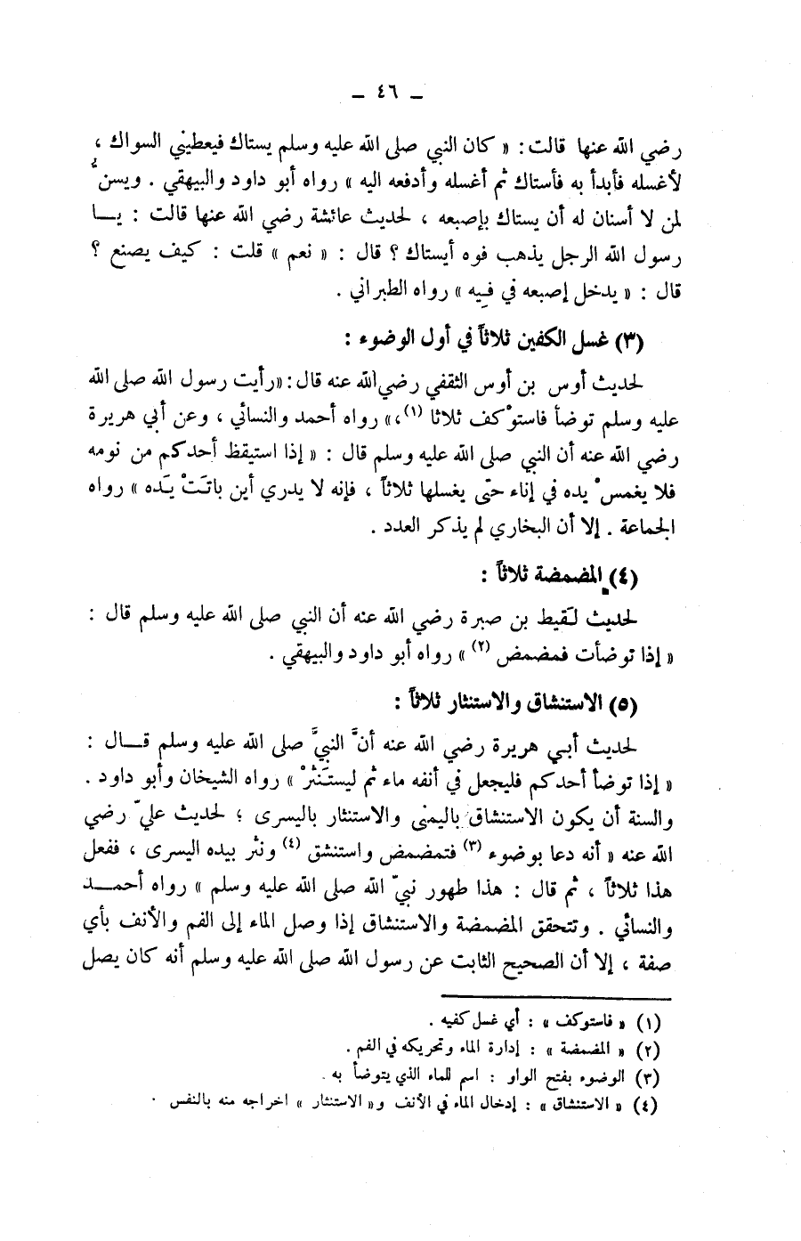 (3) غسل الكفين ثلاثا في أول الوضوء: لحديث أوس بن أوس الثقفي رضي الله عنه قال: (رأيت رسول الله صلى الله عليه وسلم توضأ فاستوكف ثلاثا) (1) رواه أحمد والنسائي، وعن أبي هريرة رضي الله عنه أن النبي صلى الله عليه وسلم قال: (إذا استيقظ أحدكم من نومه فلا يغمس يده في إناء حتى يغسلها ثلاثا، فإنه لا يدري أين باتت يده) رواه الجماعة.
