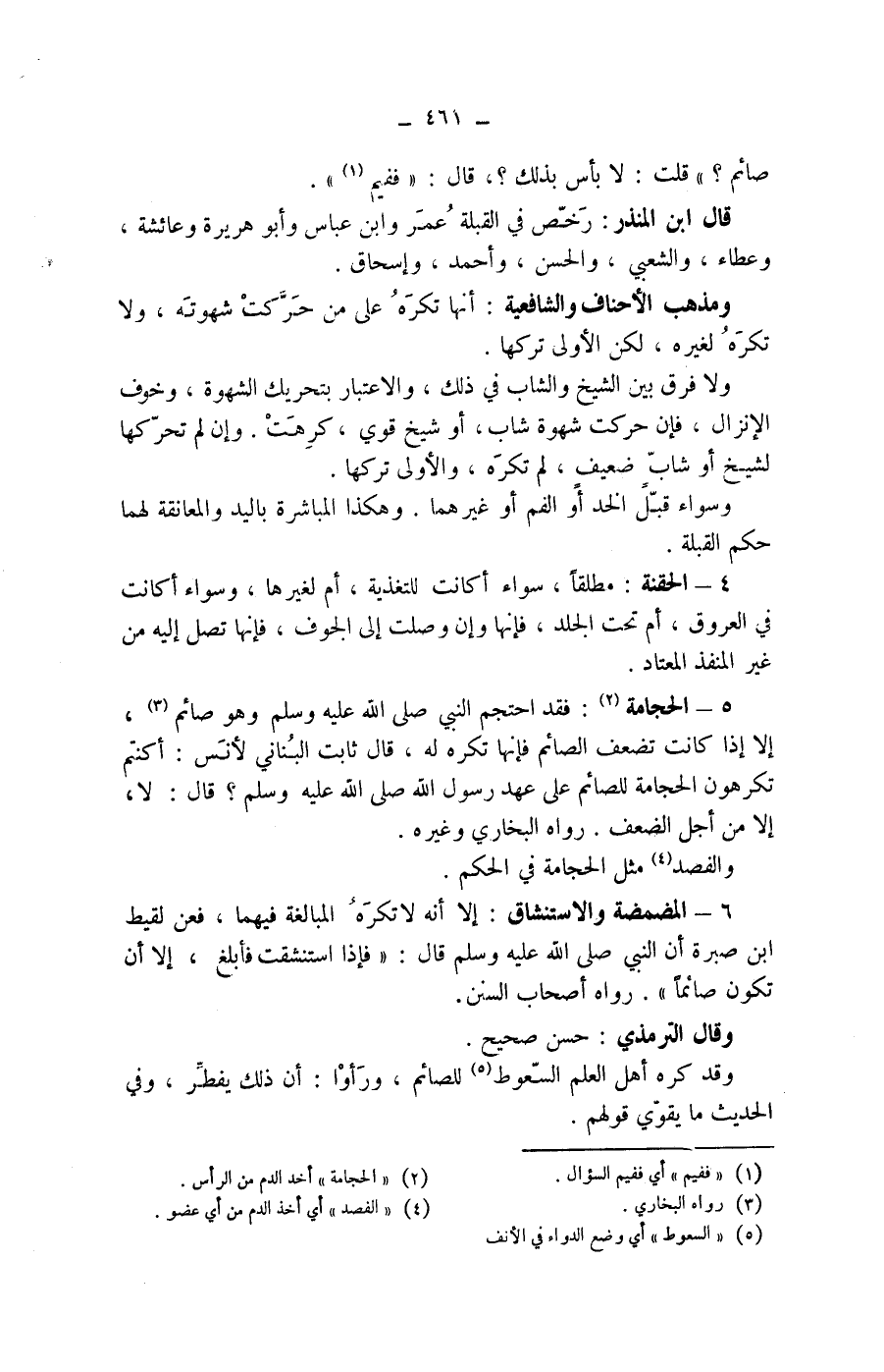 5 - الحجامة (2) : فقد احتجم النبي صلى الله عليه وسلم وهو صائم (3) ، إلا إذا كانت تضعف الصائم فإنها تكره له، قال ثابت البناني لانس: أكنتم تكرهون الحجامة للصائم على عهد رسول الله صلى الله عليه وسلم؟ قال: لا، إلا من أجل الضعف.