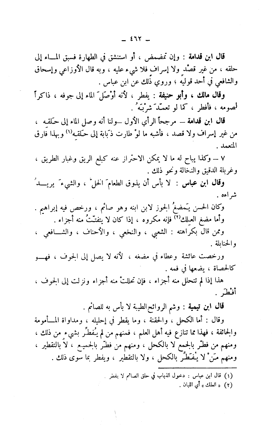 وقال: أما الكحل، والحقنة، وما يقطر في إحليله، ومداواة المأمومة والجائفة، فهذا مما تنازع فيه أهل العلم، فمنهم من لم يفطر بشئ من ذلك، ومنهم من فطر بالجمع لا بالكحل، ومنهم من فطر بالجميع، لا بالتقطير، ومنهم من لا يفطر بالكحل، ولا بالتقطير، ويفطر بما سوى ذلك.
