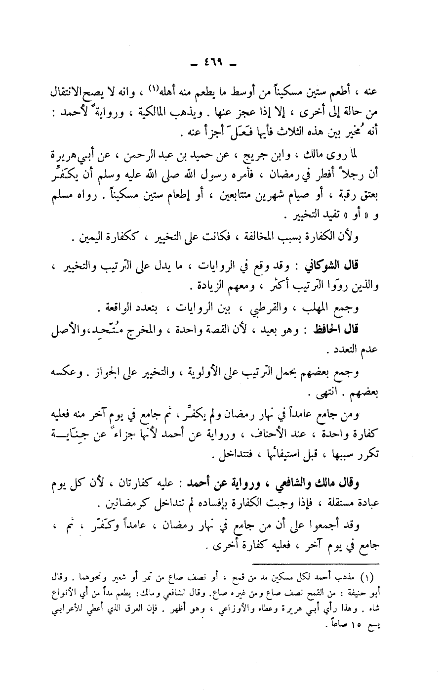 ومن جامع عامدا في نهار رمضان ولم يكفر، ثم جامع في يوم آخر منه فعليه كفارة واحدة، عند الاحناف، ورواية عن أحمد لانها جزاء عن جناية تكرر سببها، قبل استيفائها، فتتداخل.